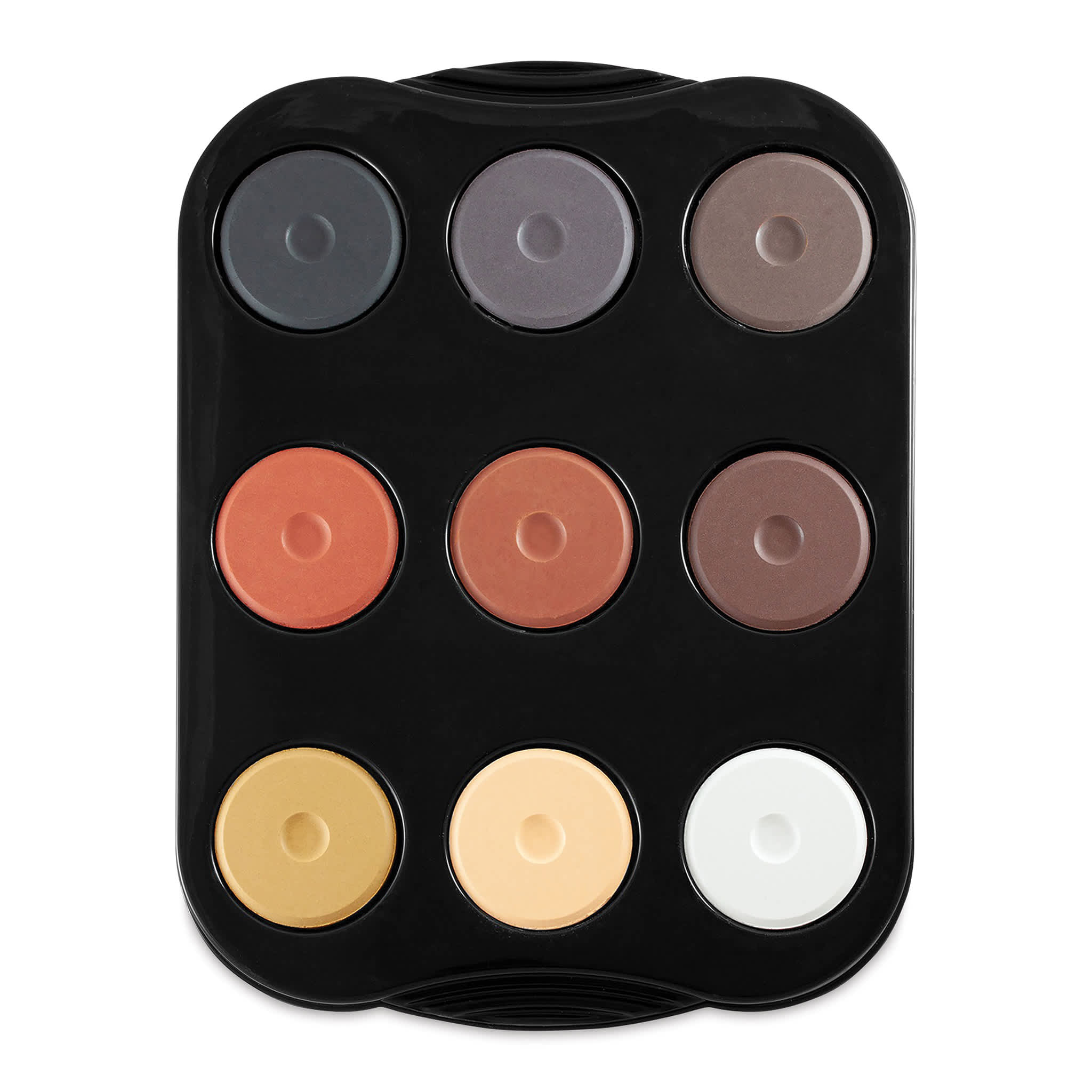 This set is ideal for depicting all the skin tones of the world. It includes Black, Van Dyke Brown, Burnt Umber, Burnt Sienna, Sienna Brown, Light Brown, Yellow Ochre, Flesh, and White mini cakes in a black tray.