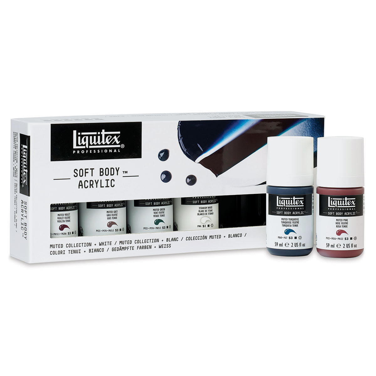 View Product DetailsLiquitex Soft Body Acrylic - Muted Collection + White Set of 6 Outside of Package