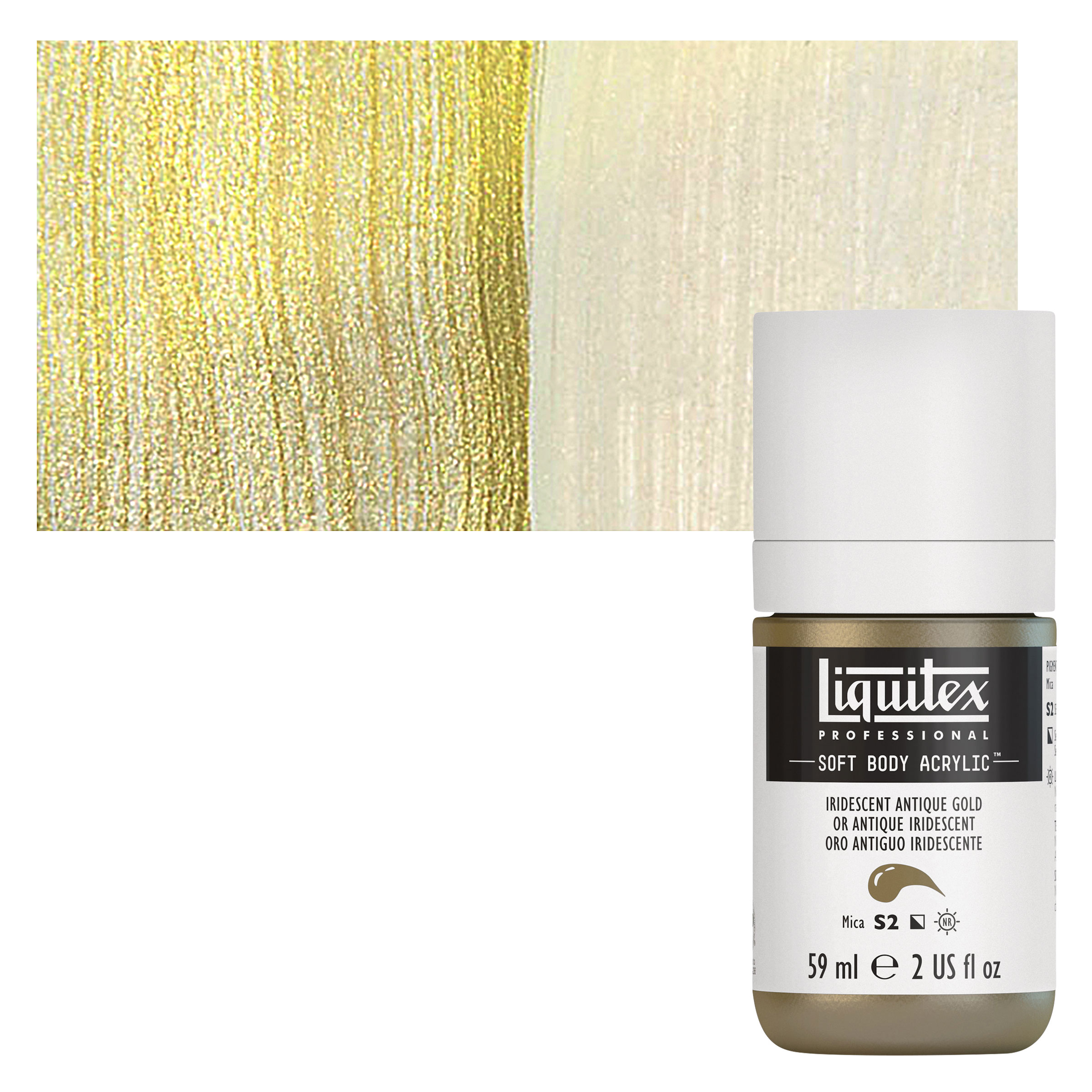 View Product DetailsLiquitex Soft Body Artist Acrylic - Iridescent Antique Gold, 59 ml bottle and swatch