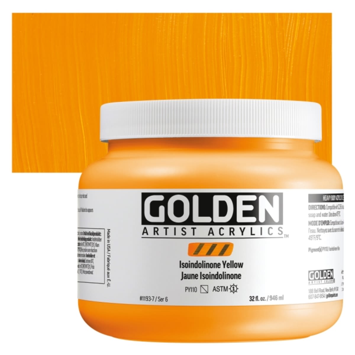 View Product DetailsGolden Heavy Body Acrylic Paint - Isoindolinone Yellow, 946 ml Jar and swatch