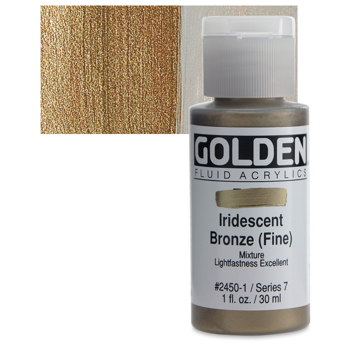 View Product DetailsGolden Fluid Acrylic - Iridescent Bronze (Fine), 1 oz bottle and swatch