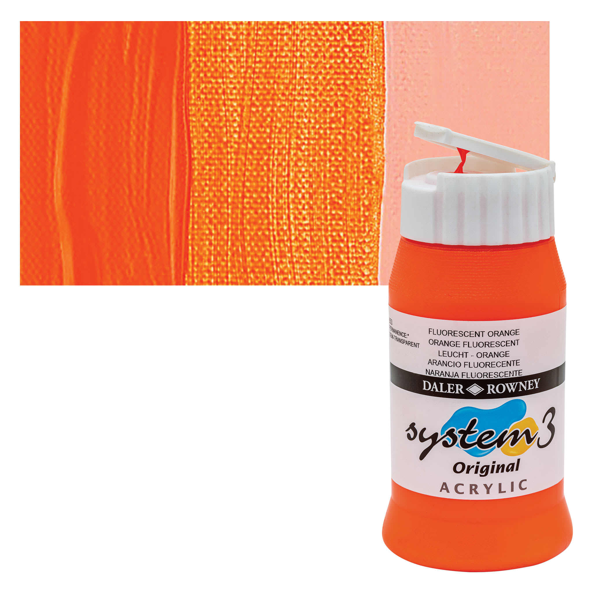 View Product DetailsDaler-Rowney System3 Acrylic - Fluorescent Orange, 500 ml bottle and swatch