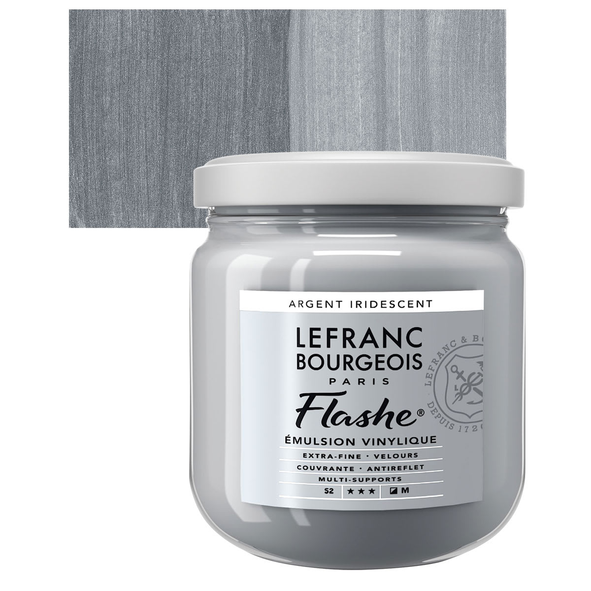 Lefranc & Bourgeois Flashe Vinyl Paint - Iridescent Silver 400 ml jar and swatch