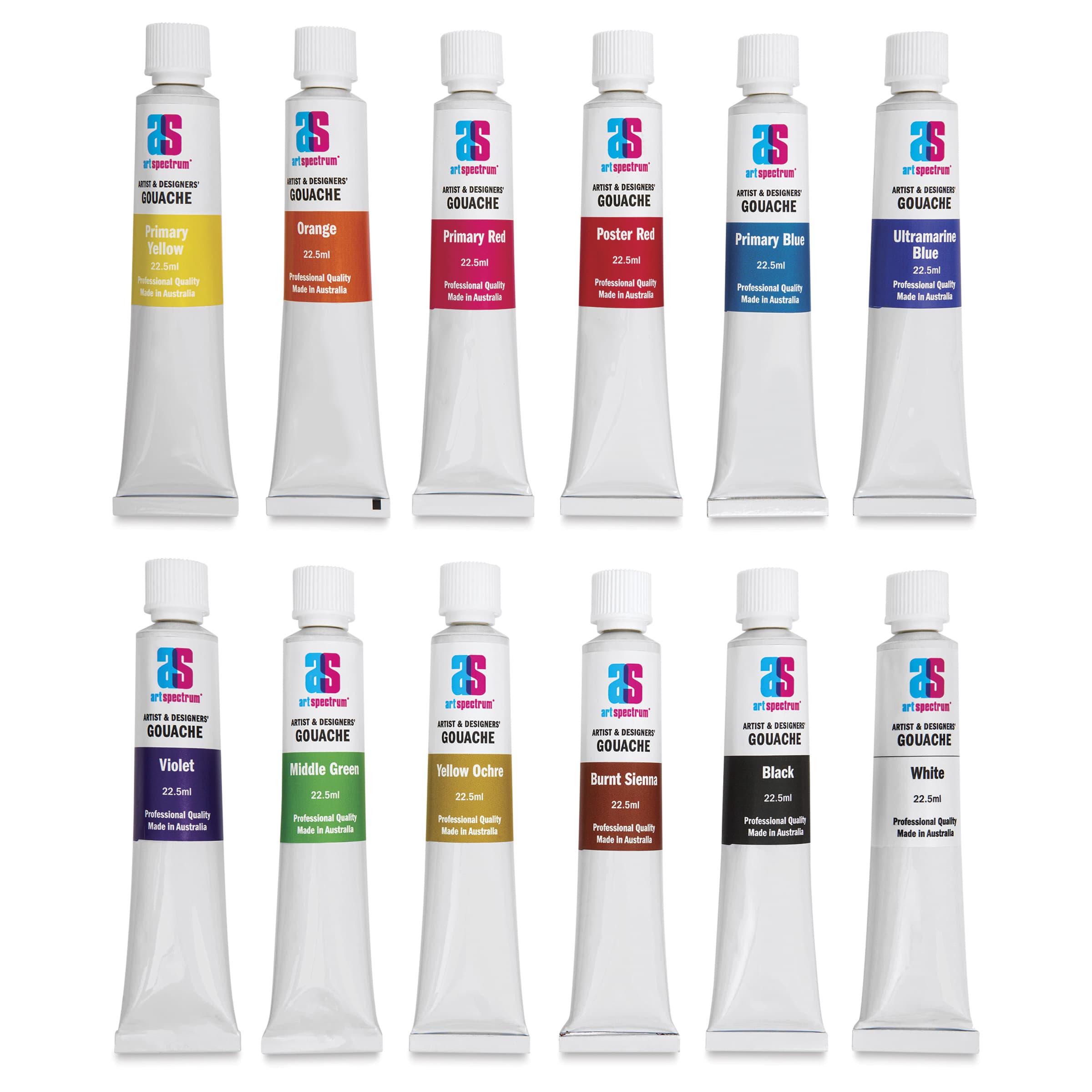 This comprehensive set supports all painting styles, making it perfect for professionals and beginners. It includes 12 versatile colors: Primary Yellow, Primary Red, Primary Blue, Yellow Ochre, Black, White, Orange, Poster Red, Violet, Middle Green, Burnt Sienna, and Ultramarine.