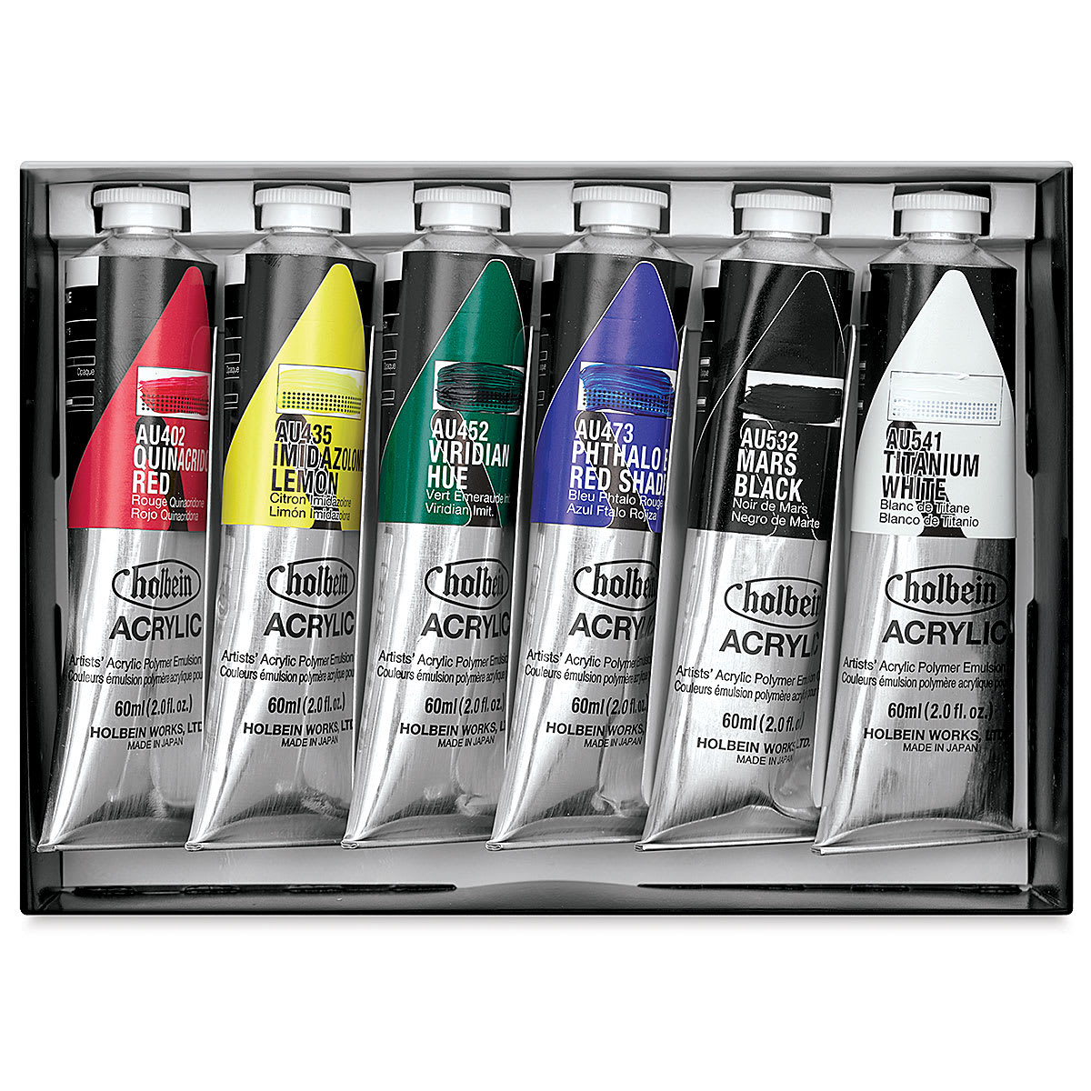 This set provides a great basic palette for the beginning painter or anyone interested in testing out the quality of Holbein Heavy Body Acrylics. It contains 2 oz (60 ml) tubes of Quinacridone Red, Imidazolone Lemon, Viridian Hue, Phthalo Blue (Red Shade), Mars Black, and Titanium White.