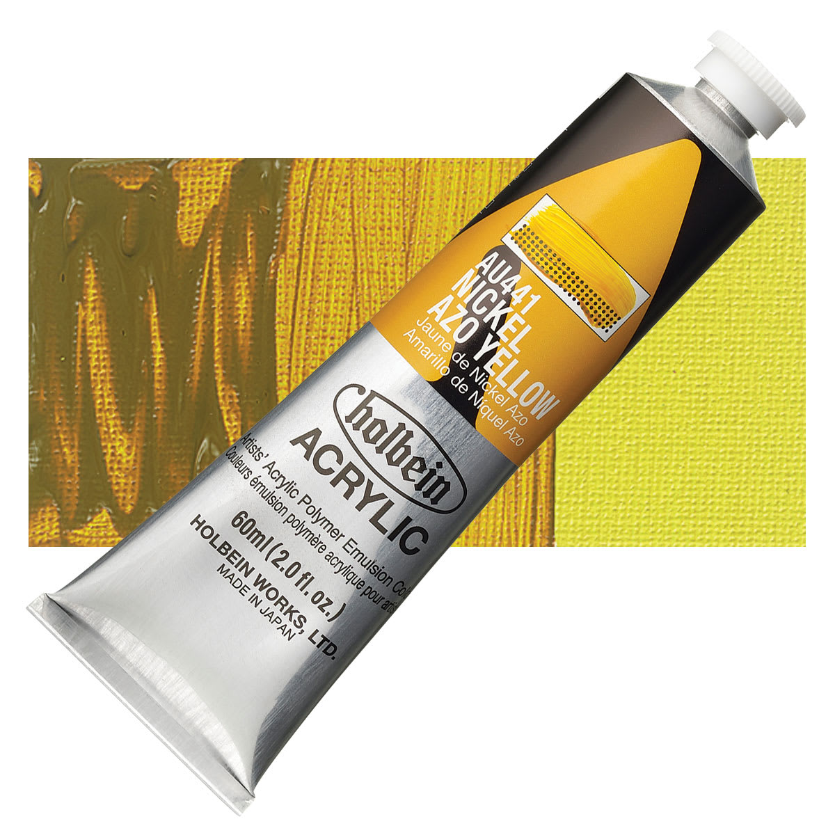 View Product DetailsHolbein Heavy Body Artist Acrylic Paint - Nickel Azo Yellow, 60 ml tube and swatch