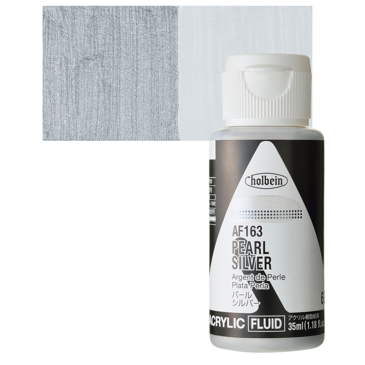 View Product DetailsHolbein Fluid Acrylic Paint - Pearl Silver, 35 ml Bottle and swatch