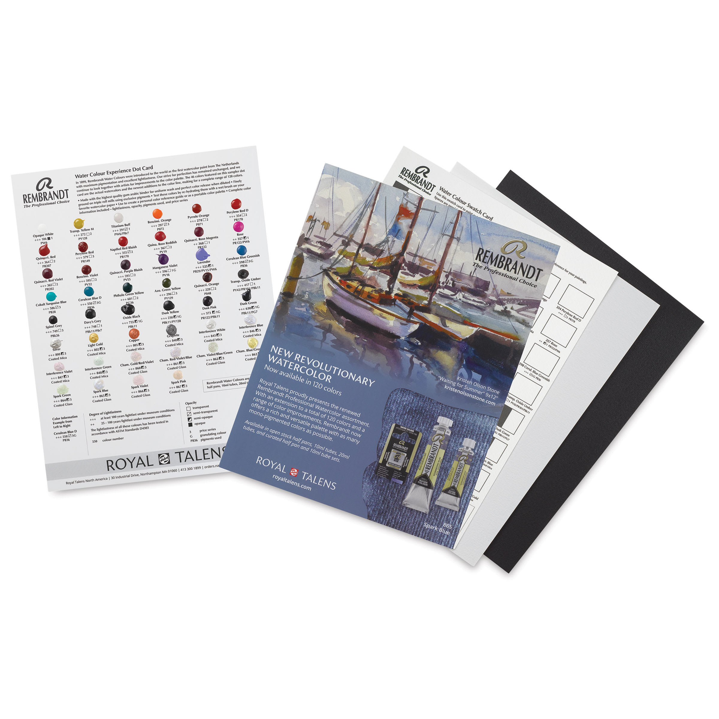 An affordable way to discover dozens of new additions to the range, including exclusive mono-pigment colors and exciting specialty shades. Kit includes a 46-color dot card containing enough of color for several trials, one 8-1/2″ × 11″ sheet each of White and Black 140 lb Rembrandt Watercolor Paper, a Swatch Card that can be used as a personal mixing palette and color reference tool, and an informational leaflet charting each color of the 120-color watercolor range. Dot card measures 8-1/2" × 11". Each paint sample is labeled with its pigment information, price series, opacity, and lightfastness rating. Colors include Opaque White, Transparent Yellow Medium, Titanium Buff, Benzimi Orange, Pyrrole Orange, Perylene Red Deep, Quinacridone Red, Perylene Red, Naphthol Red Bluish, Quinacridone Rose Reddish, Quinacridone Rose Magenta, Rose, Quinacridone Red Violet, Benzimi Violet, Quinacridone Purple Bluish, Manganese Violet, Lavender, Cerulean Blue Greenish, Cobalt Turquoise Blue, Cerulean Blue Deep, Phthalo Green Yellow, Azo Green Yellow, Quinacridone Orange, Transparent Oxide Umber, Spinel Grey, Davy’s Grey, Oxide Black, Dusk Yellow, Dusk Pink, Dusk Green, Silver, Light Gold, Copper, Graphite, Interference White, Interference Blue, Interference Violet, Interference Green, Chameleon Gold/Red/Violet, Chameleon Red/Violet/Blue, Chameleon Violet/Blue/Green, Chameleon Blue/Green/Gold, Spark Green, Spark Blue, Spark Violet, and Spark Pink.
