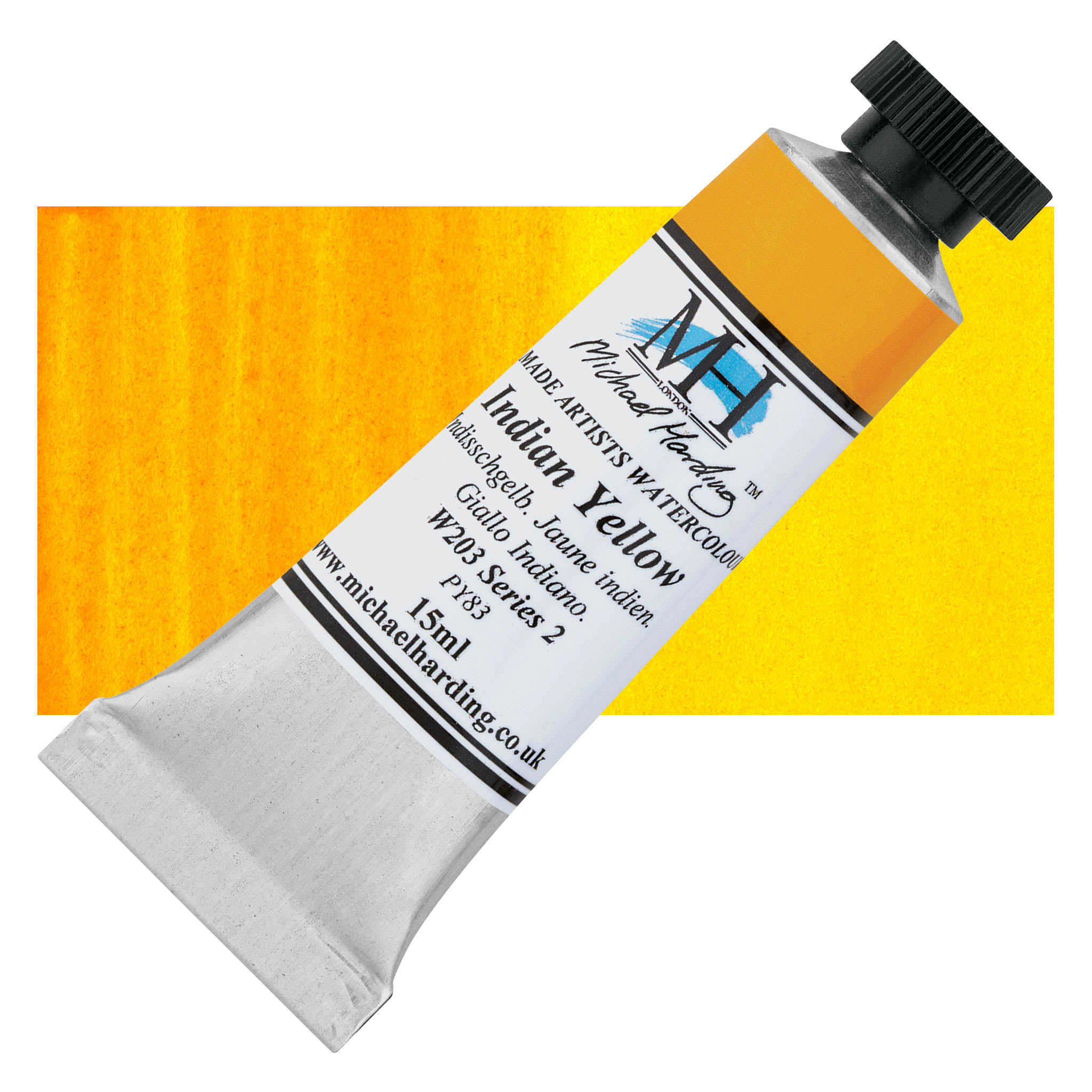 Michael Harding Artists Watercolor - Indian Yellow, 15 ml tube and swatch