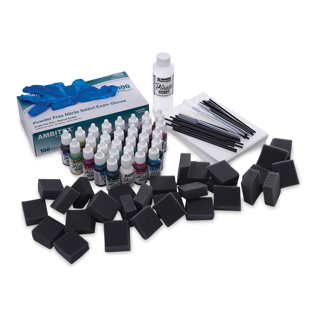 Introduce your class to the colorful, abstract world of alcohol ink! This set contains everything you need to create 60 paintings, including 30 bottles of 0.5 oz (15 ml) Piñata Alcohol Ink, four each of Sunbright Yellow, Señorita Magenta, Passion Purple, Baja Blue, Blanco Blanco, and Rich Gold, plus three each of Calabaza Orange and Rainforest Green. It also includes one, 4 oz (118 ml) bottle of Piñata Clean Up Solution, 60 sheets of 5" x 7" Yupo Synthetic Paper, 30 black sponges, 30 straws, 5 transfer pipettes, 100 gloves, and an instruction sheet.