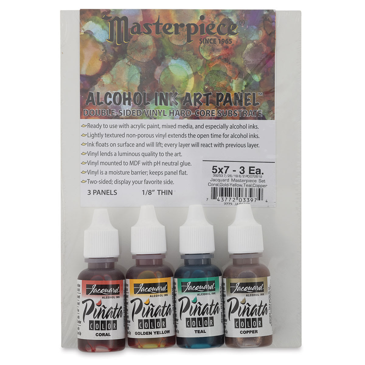 The perfect pair! Create a subtly pearlescent finish with this set. It combines Piñata Alcohol Inks with lightly textured, warp-resistant, double-sided Masterpiece Alcohol Ink Art Panels, which extend the open time and accentuate the vibrancy of the inks. The panels prevent the inks from spreading as freely, giving the artist more control. This set includes four 0.5 oz bottles of Piñata colors in Coral, Golden Yellow, Teal, and Copper, plus three 5" x 7" Masterpiece Alcohol Ink Art Panels.