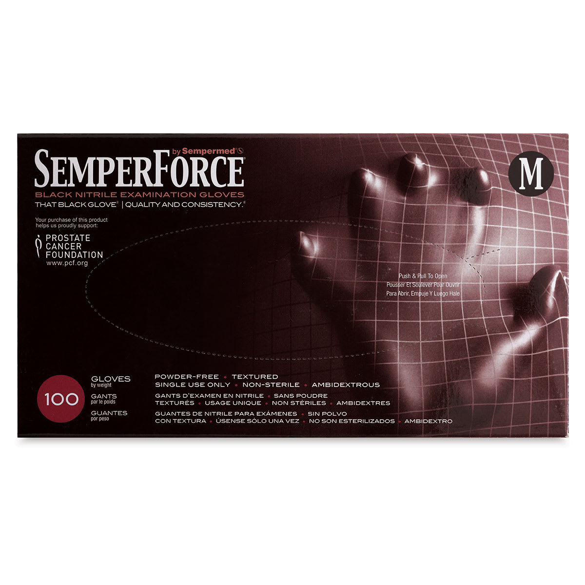 View Product DetailsSemperForce Black Nitrile Gloves - Front of package of Medium size gloves shown
