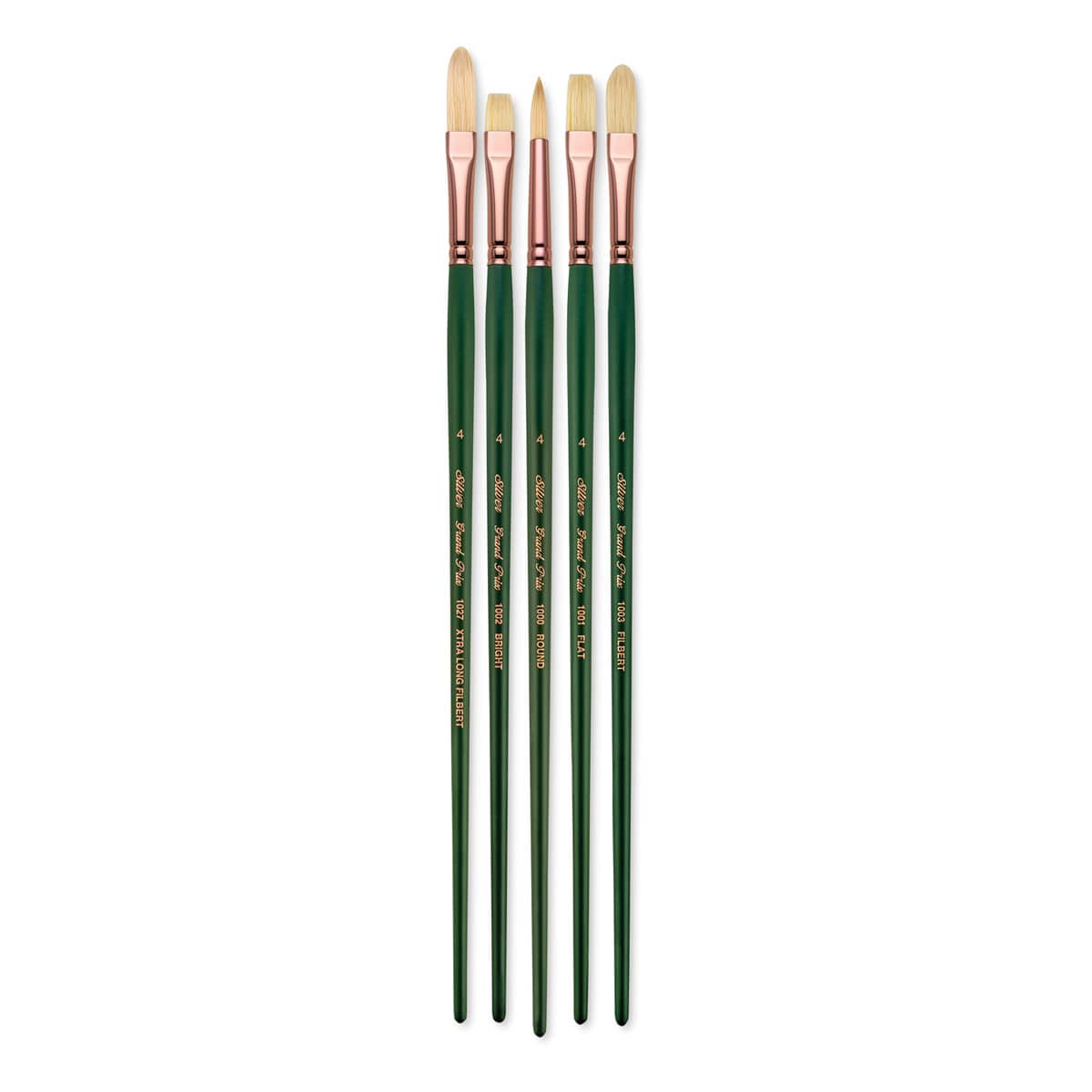 This set contains one Series 1000 Grand Prix Round size 4, one Series 1001 Grand Prix Flat size 4, one Series 1002 Grand Prix Bright size 4, one Series 1003 Grand Prix Filbert size 4, and one Series 1027 Grand Prix Extra Long Filbert size 4.