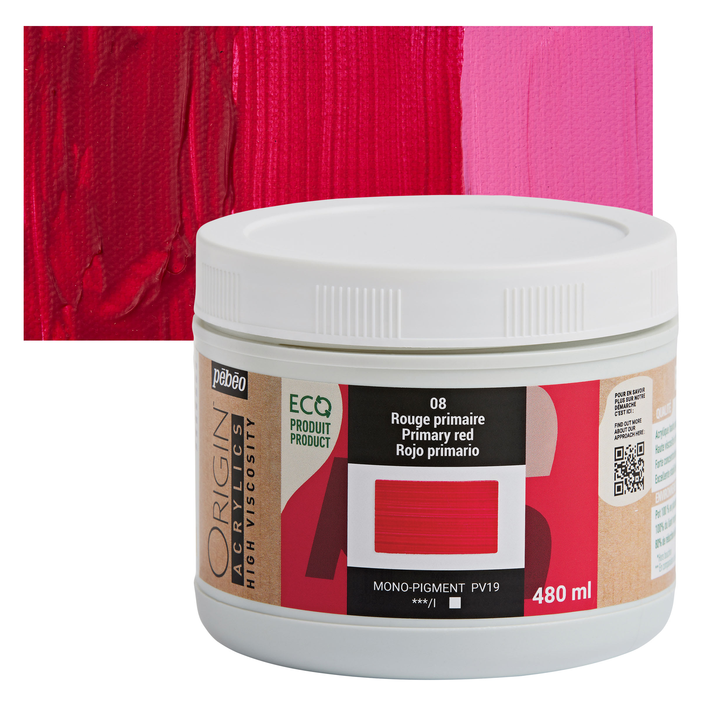 View Product DetailsPebeo Origin Acrylic Paint - Primary Red, 480 ml jar and swatch
