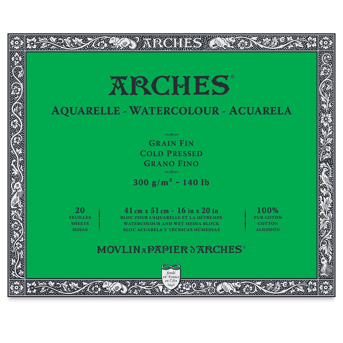 View Product DetailsArches Watercolor Block - Cold Press, 16" x 20", 140 lb (300 gsm), 20 sheets. Green cover.