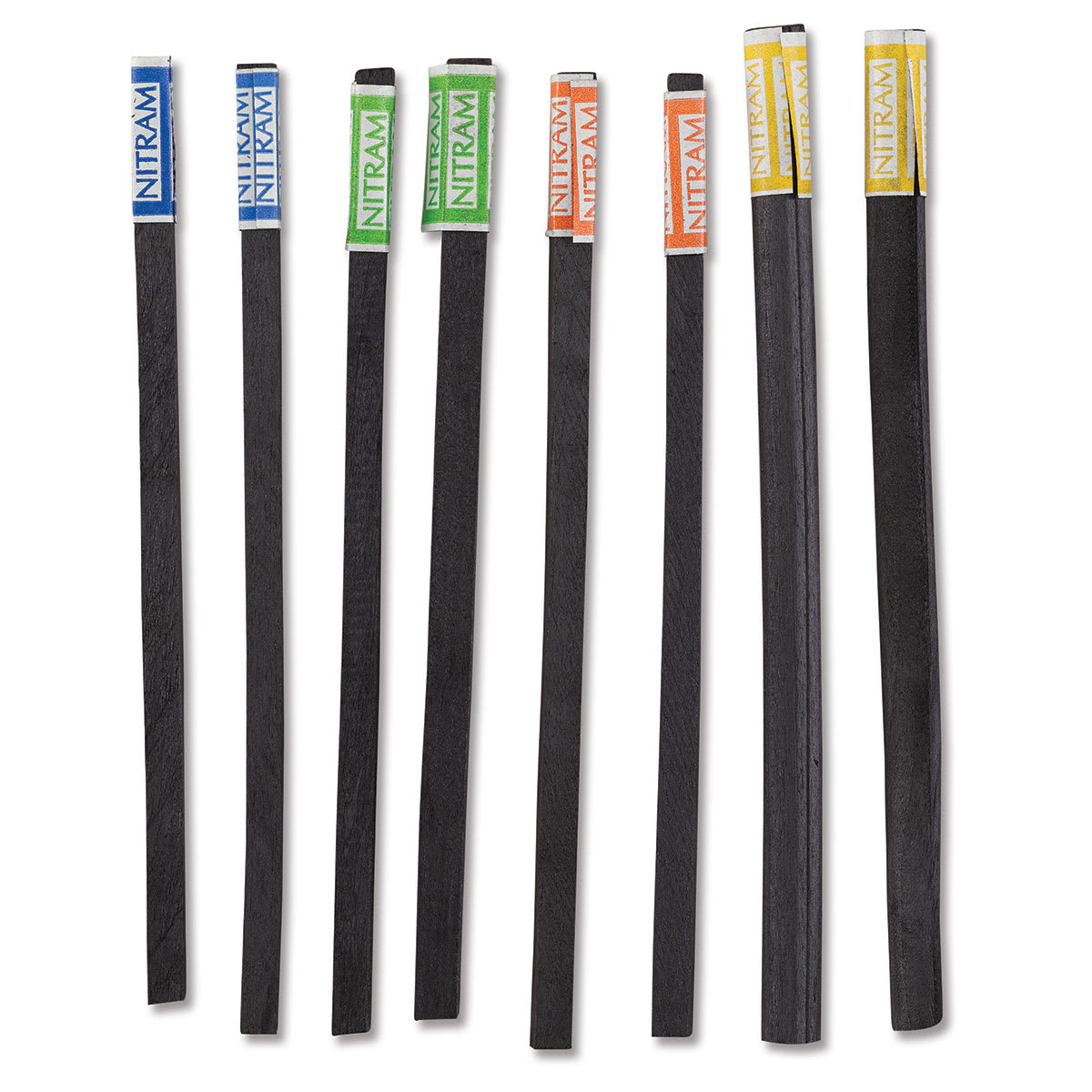 Designed to fit the Nitram Stylus, this assortment of eight Nitram Soft Charcoal Sticks contains two each of H (Hard, 5 mm) , HB (Medium, 5 mm), B (Soft, 5 mm), and B+ (Extra Soft, 6 mm).