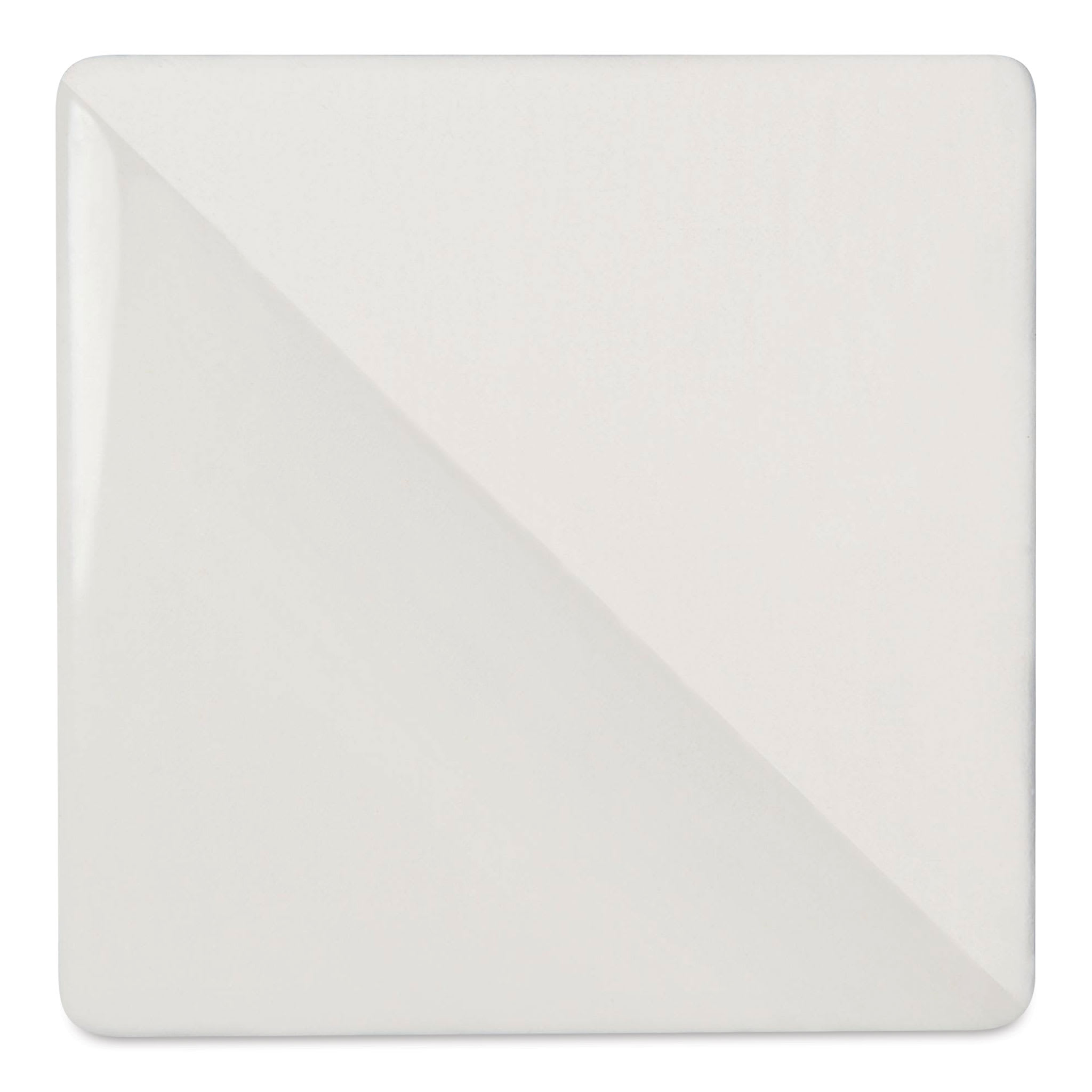 View Product DetailsSpeedball Ceramic Underglaze - White, Opaque, 2 oz, fired on white clay bisque tiles, half covered in Speedball Clear Glaze, fired to cone 05
