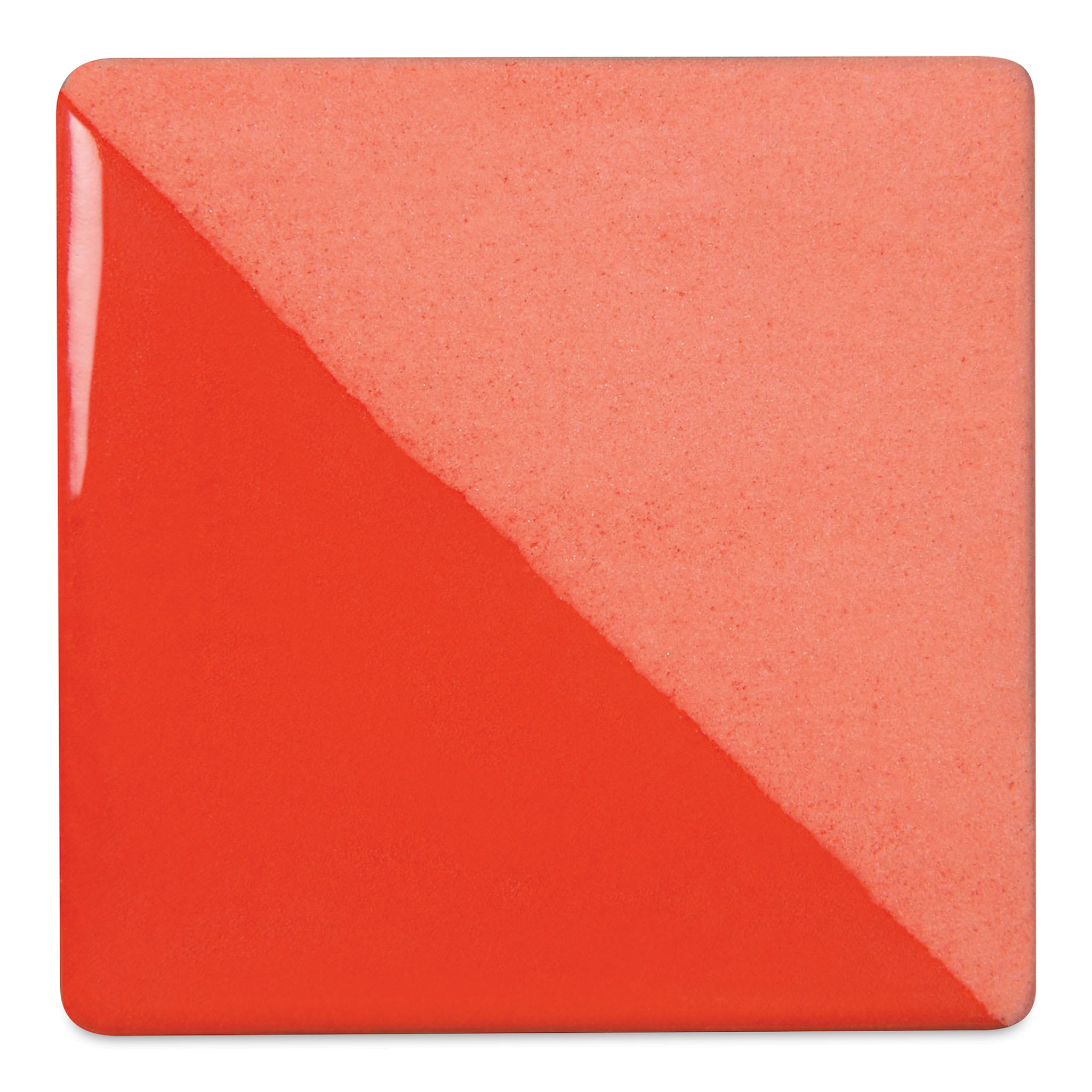 View Product DetailsSpeedball Ceramic Underglaze - Flame Red, Opaque, fired on white clay bisque tiles, half covered in Speedball Clear Glaze, fired to cone 05