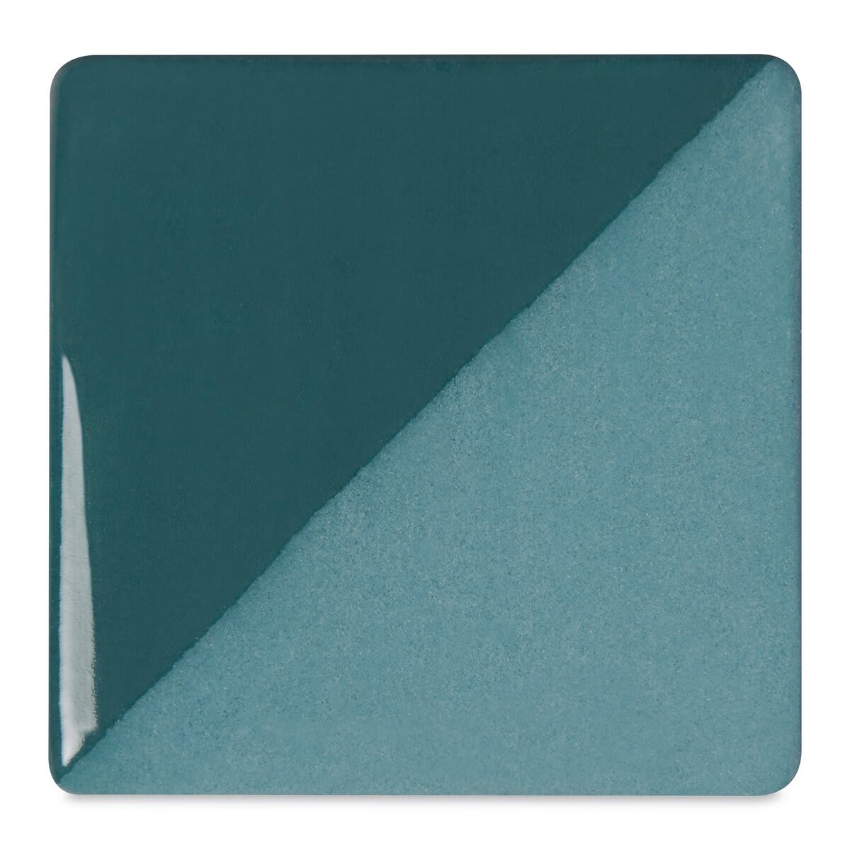 View Product DetailsSpeedball Ceramic Underglaze - Teal, Opaque, fired on white clay bisque tiles, half covered in Speedball Clear Glaze, fired to cone 05