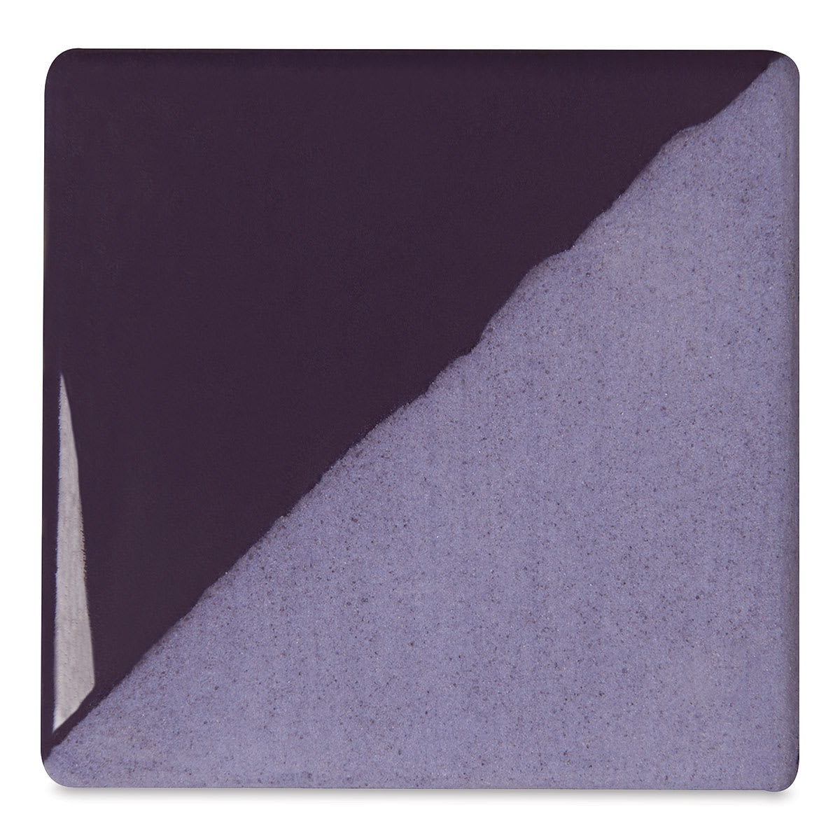 View Product DetailsSpeedball Ceramic Underglaze - Royal Purple, Opaque, fired on white clay bisque tiles, half covered in Speedball Clear Glaze, fired to cone 05