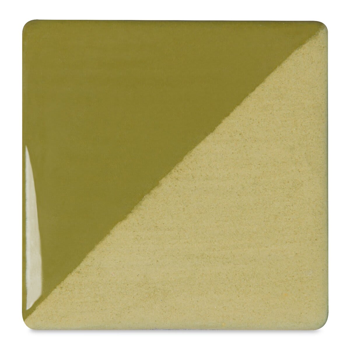 View Product DetailsSpeedball Ceramic Underglaze - Avocado, Opaque, fired on white clay bisque tiles, half covered in Speedball Clear Glaze, fired to cone 05