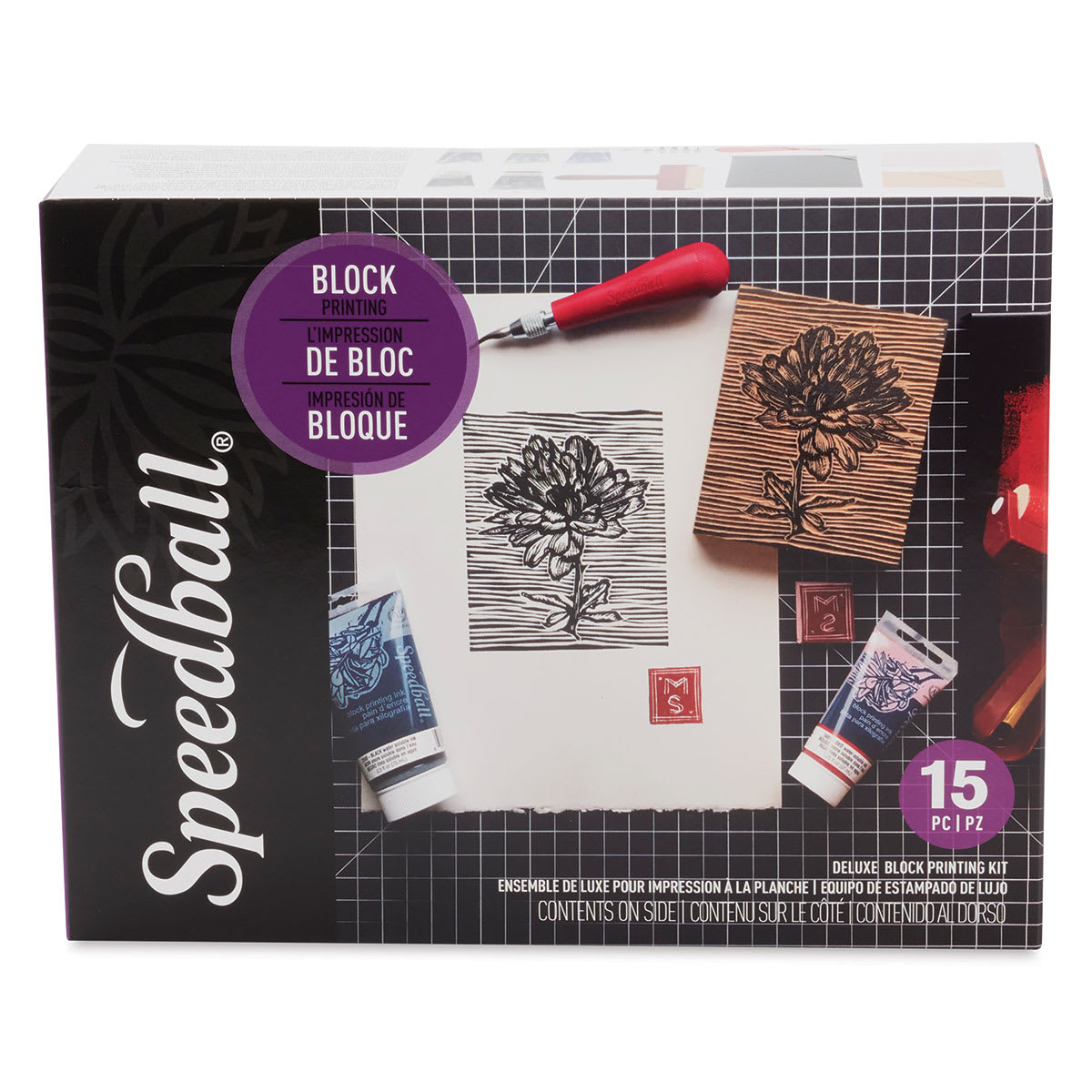 This kit includes: - 4" x 5" Mounted linoleum block - 4" x 6" Speedy-Carve block - Linoleum cutter handle - sizes #1, #2, #3, #5, and #6 linoleum cutters - 2.5 oz tube of Water-Soluble Block Printing Ink in Black - 1.25 oz tubes of Water-Soluble Block Printing Ink in Red, Blue, and Yellow - 1.25 oz tube of Water-Soluble Block Printing Extender (to create transparent colors) - 4" Soft Rubber Pop-In Brayer - Dual-purpose bench hook/inking plate - Instruction booklet