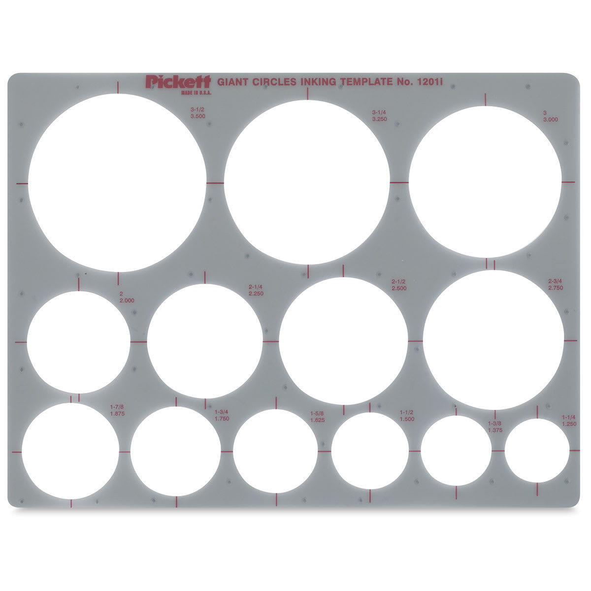 Template contains circles ranging in size from 1-1/4" to 3-1/2" in diameter. The template is 8-3/4" × 11-1/2".
