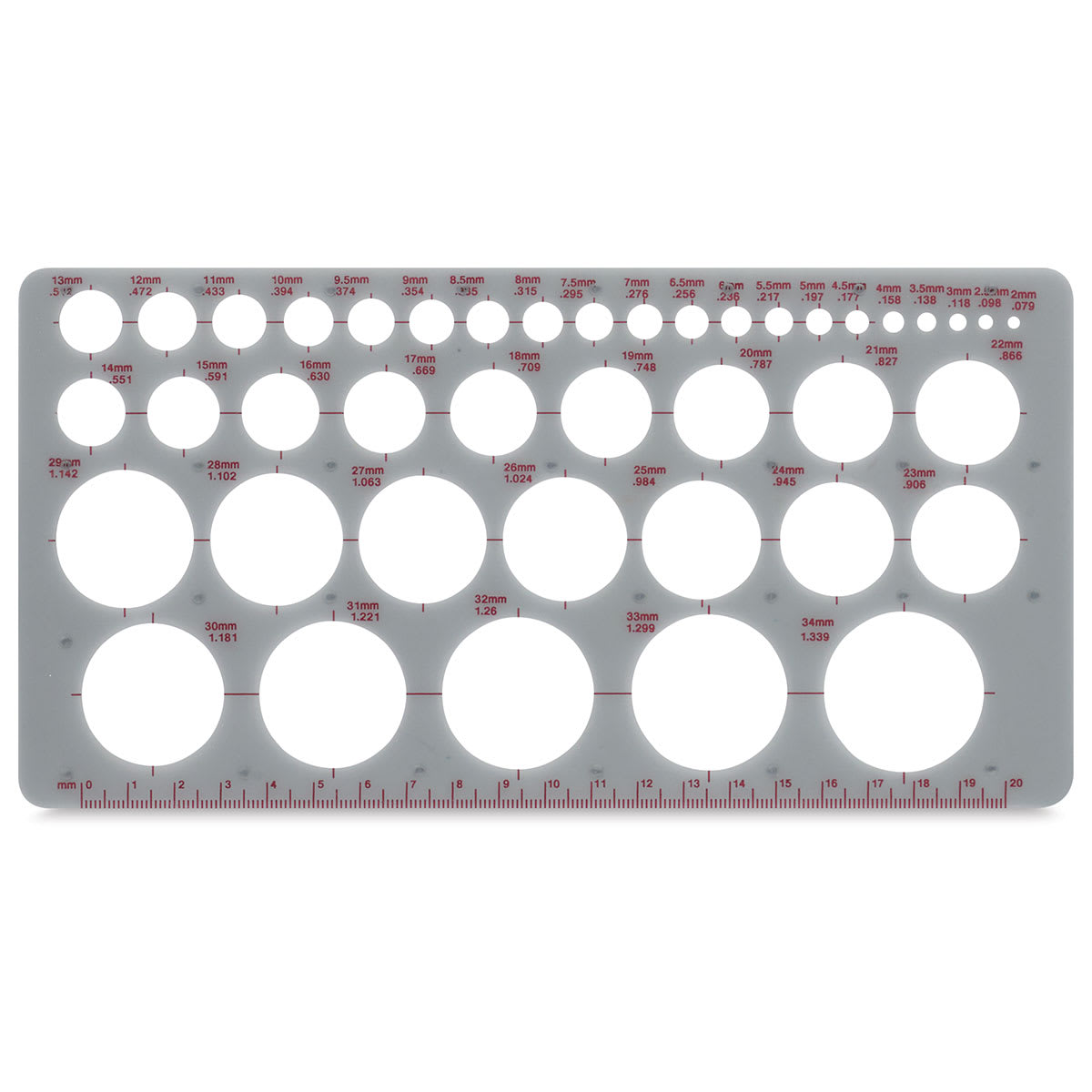 Template is scaled for metric measurements and features circles ranging in size from 2 mm to 34 mm in diameter. The template is 4-3/4" × 9".