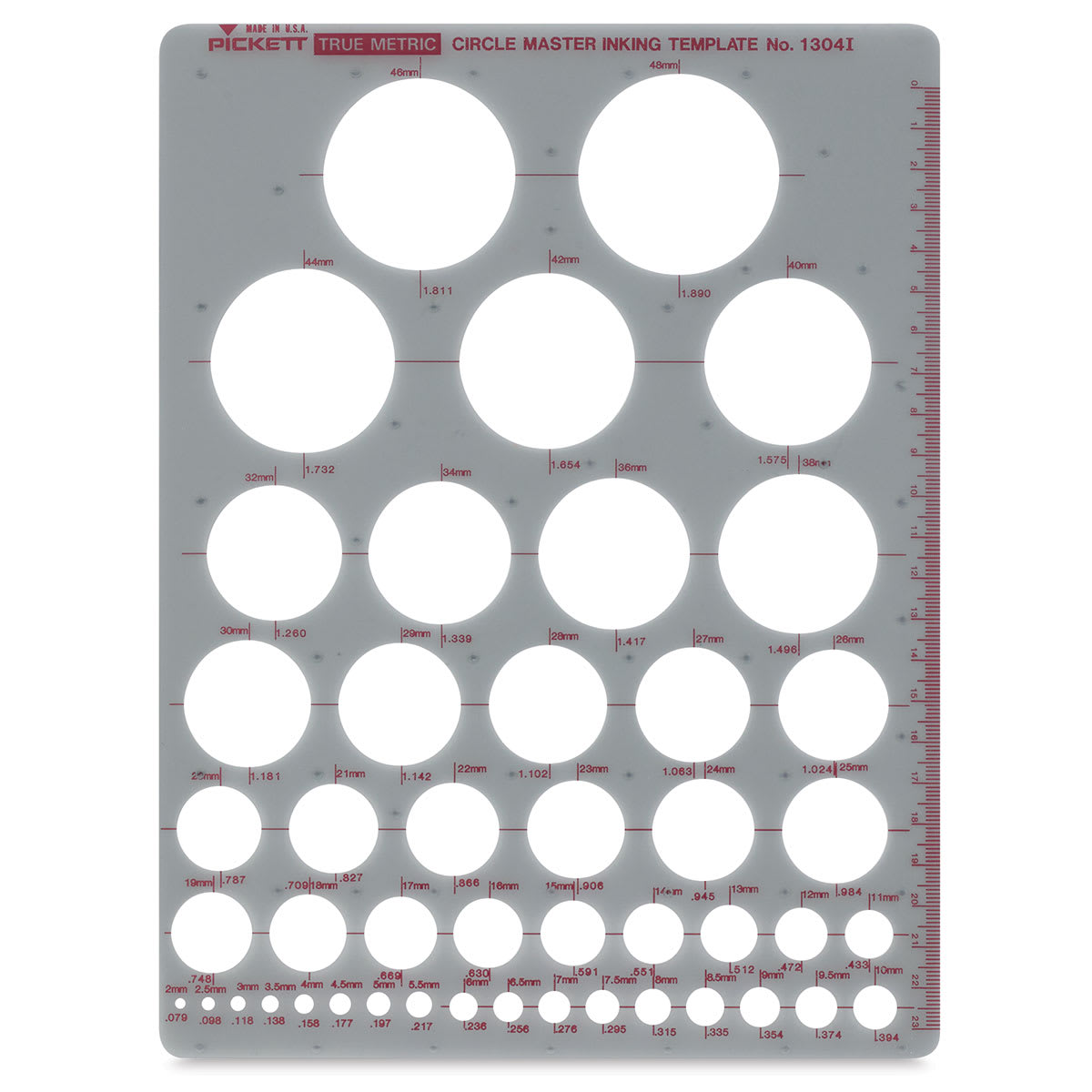 Template is scaled for metric measurements and features circles ranging in size from 2 mm to 48 mm in diameter. The template is 7-3/4" × 10".