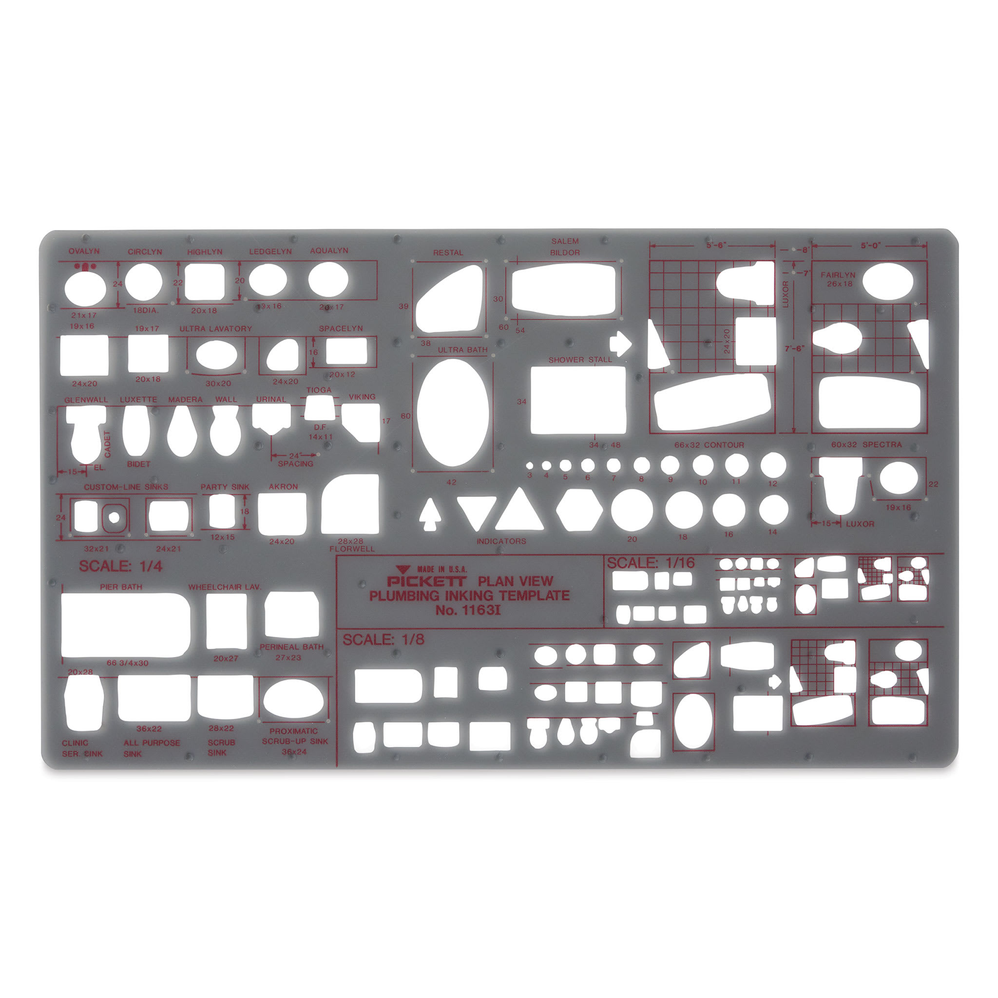 Contains standard lavatory and institutional plumbing fixture. Three scales: 1/16", 1/8" and 1/4". Translucent smoke-gray template with built-in risers and smooth apertures reduce smudged lines. Made in USA.