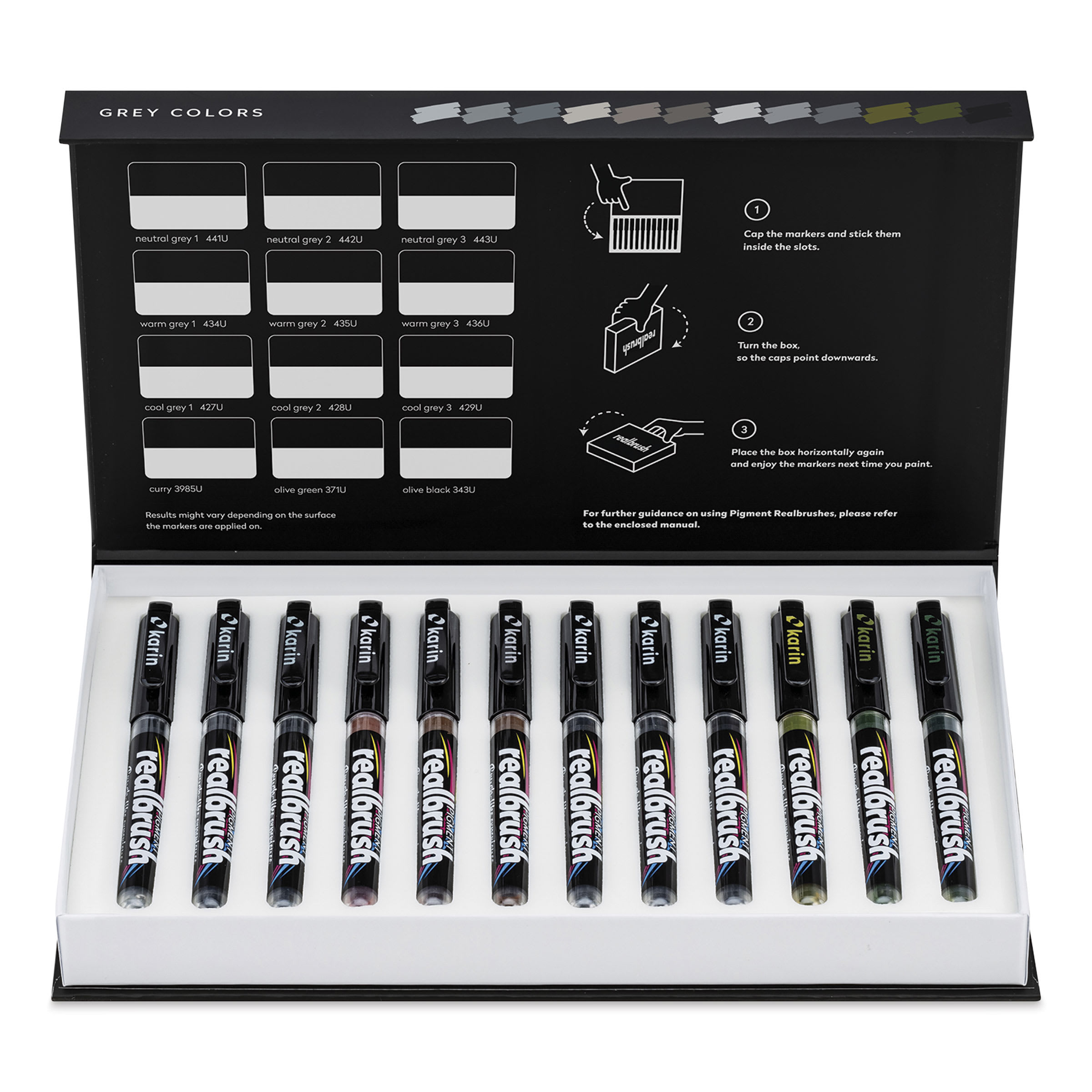 View Product DetailsKarin Realbrush Pigment Markers - Grey Colors, Set of 12, markers inside the box