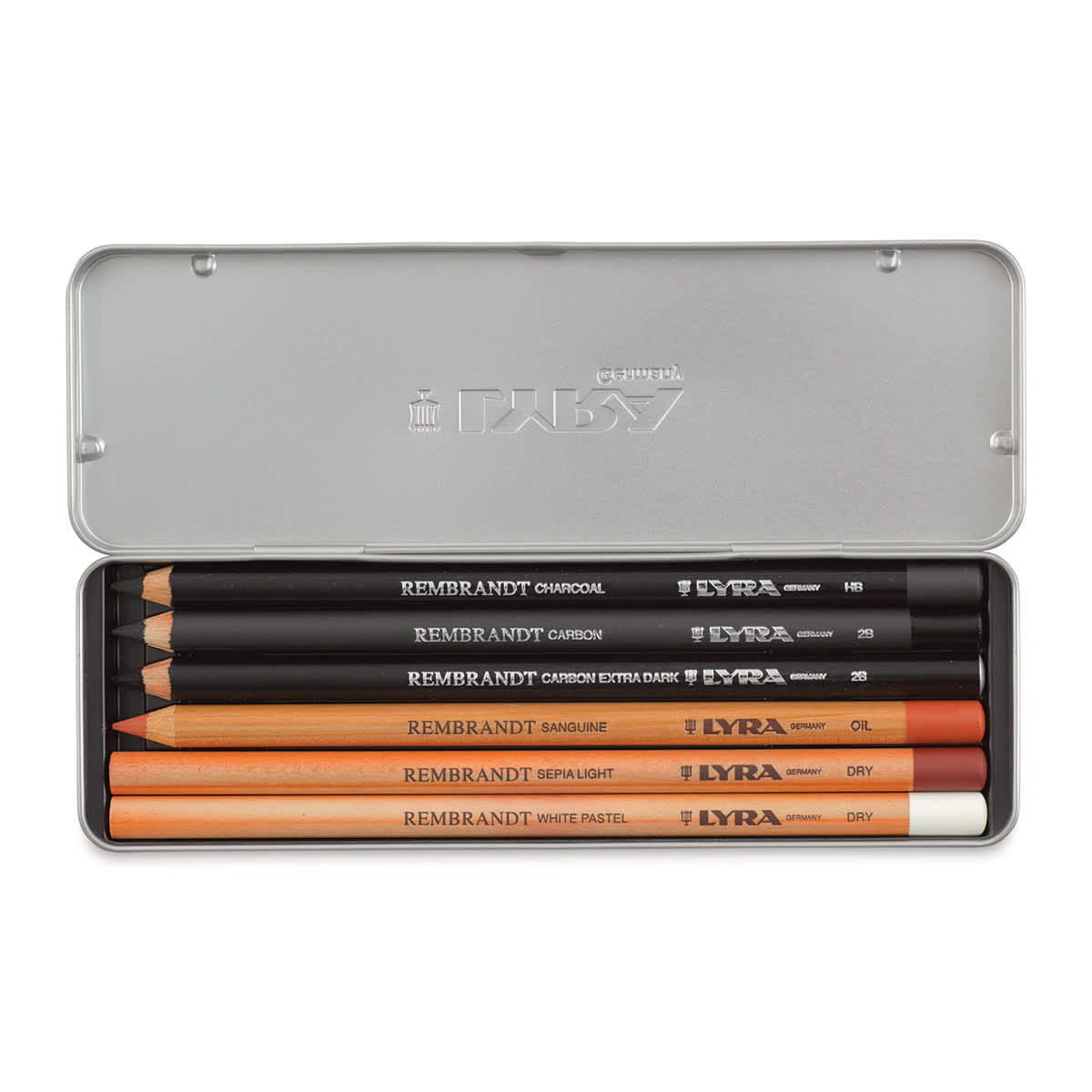 Includes White Pastel Dry, Sepia Light Dry, Sanguine Oil, Carbon 2B, Carbon Extra Dark 2B, and Charcoal HB in a stylish metal tin.