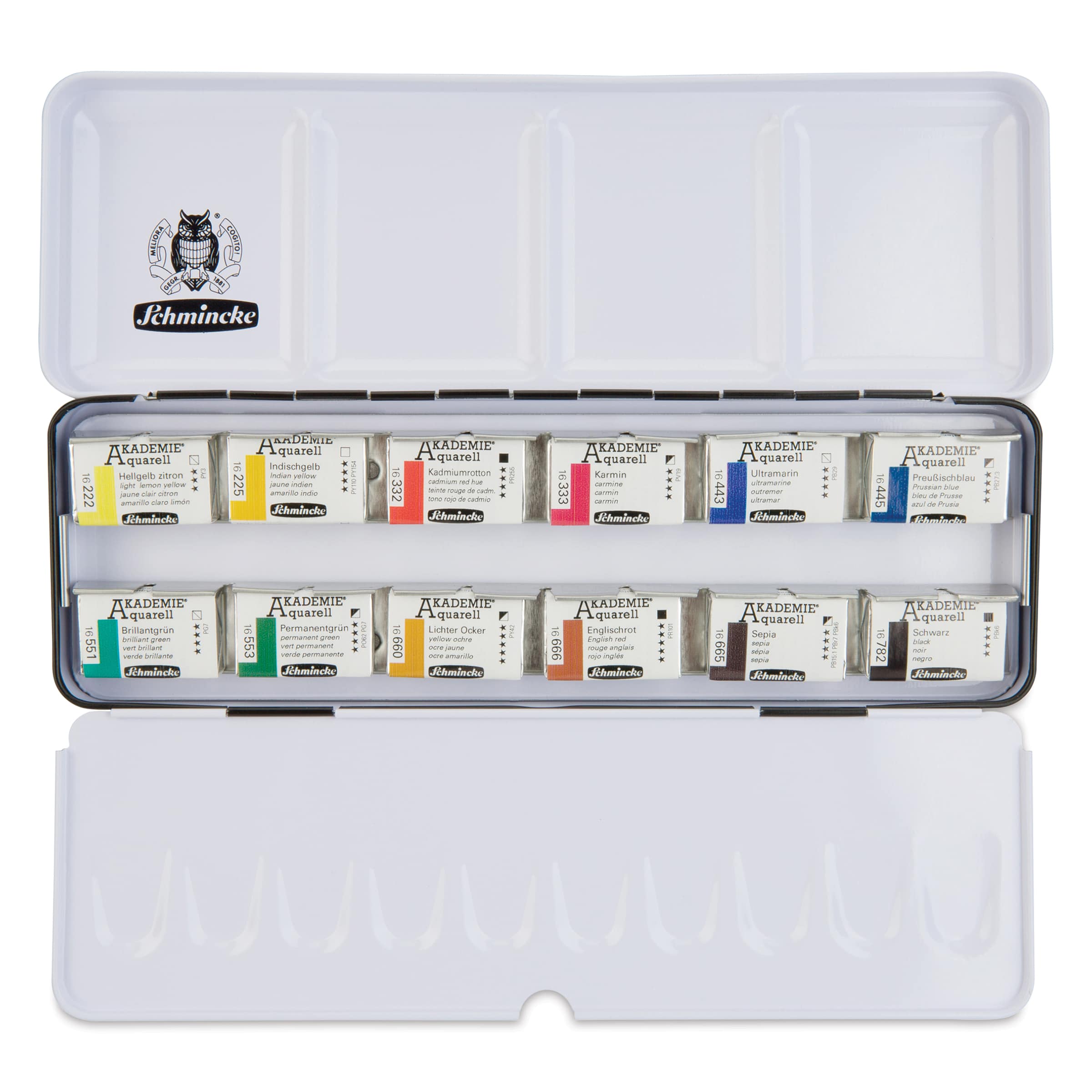 Schmincke Akademie Aquarell Watercolor Pans - Set of 12, Metal Case, Full Pans