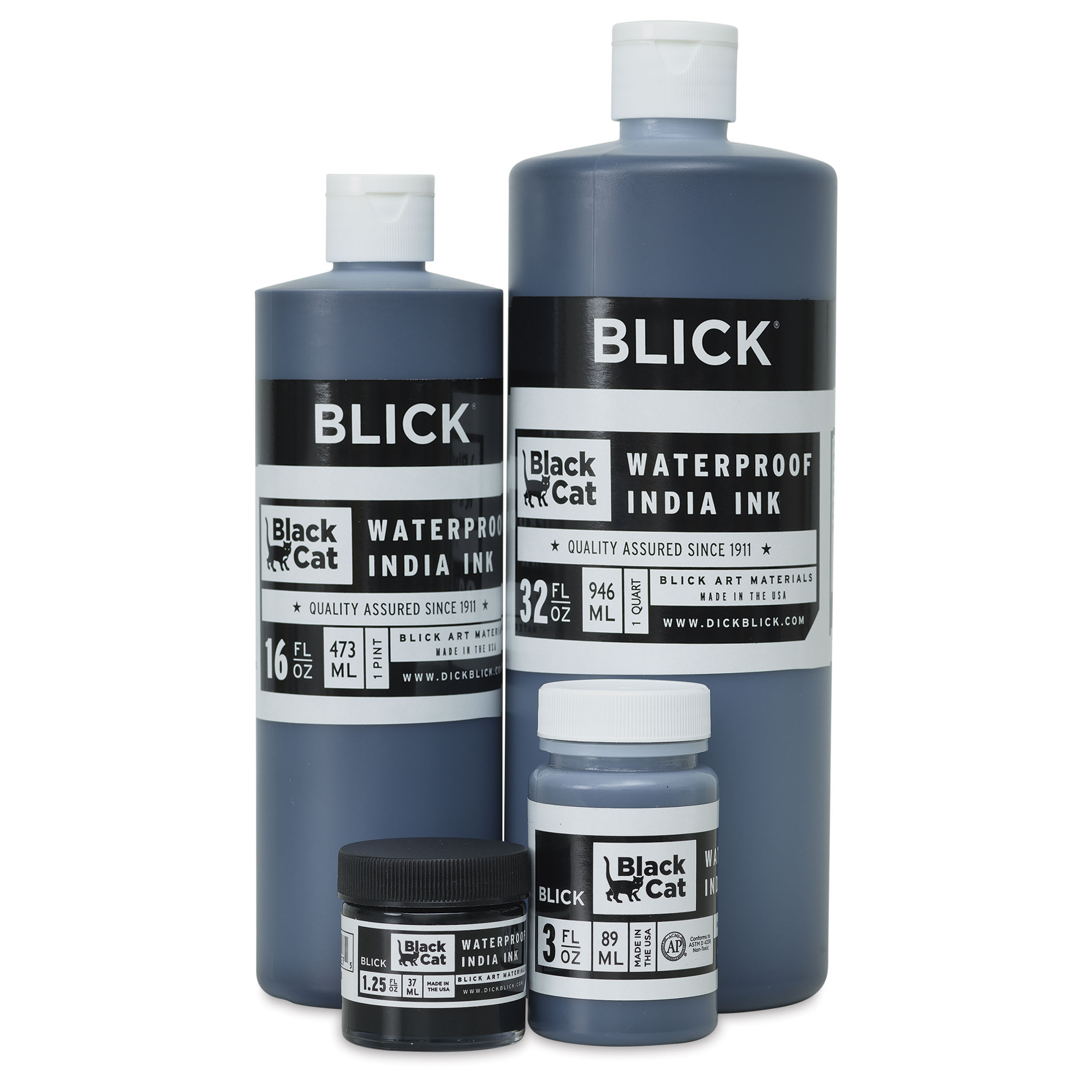 Blick Black Cat India Ink is made with 100% natural resin pigment, delivering a super-black, velvety matte finish. Crafted with the same trusted formula for over 100 years, this non-toxic, water-based ink provides a consistently smooth flow and can be diluted for subtle shading effects.