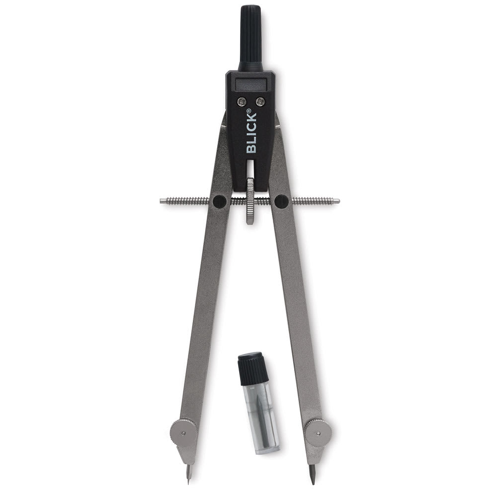 Blick Large Spring Bow Compass - Top view of compass open slightly with extra lead case adjacent