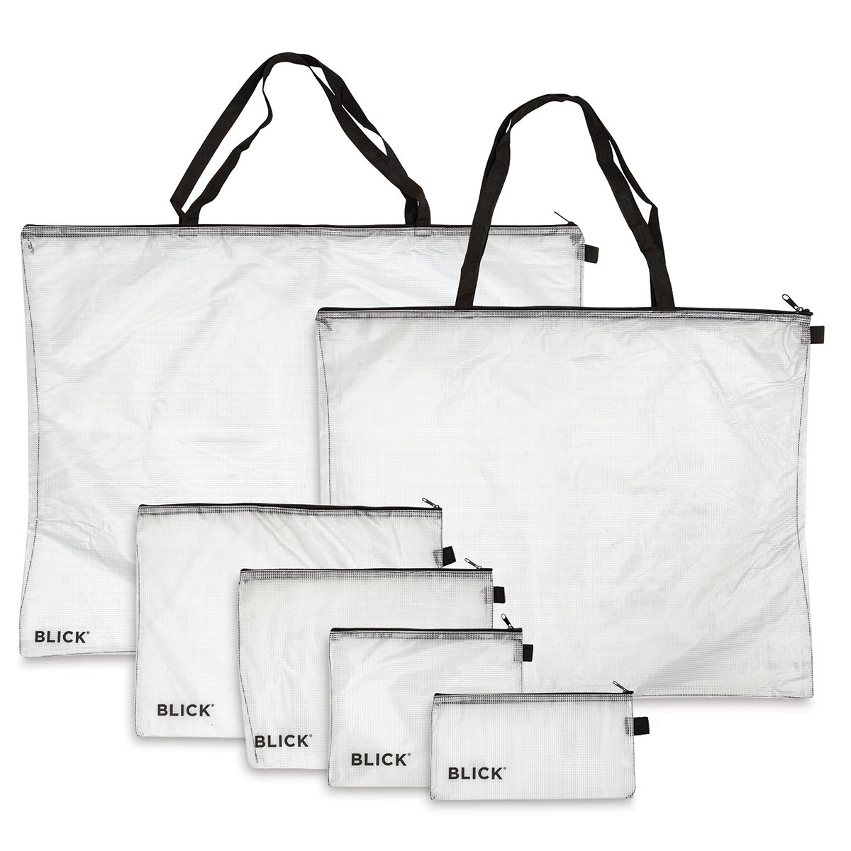 These see-through, zippered mesh bags are great for organizing and protecting school and art supplies. Made from heavy polypropylene embedded with cotton mesh, Blick Mesh Zipper Bags are available in a variety of sizes.