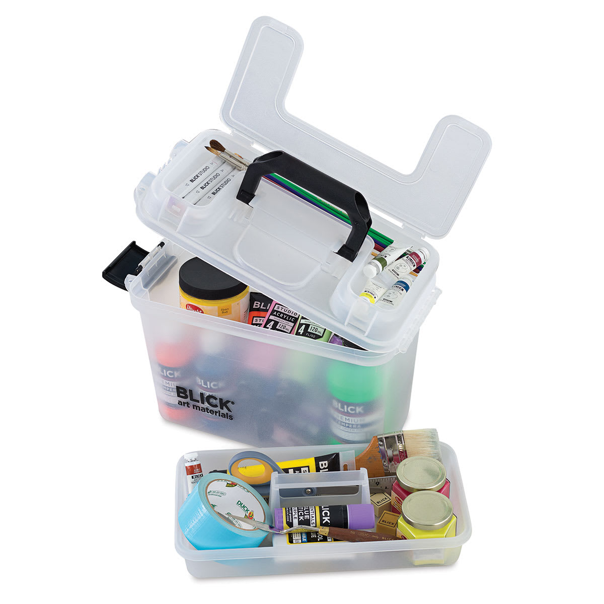An economical way to transport, store, and organize art supplies, the Blick Storage Box is made from tough, translucent polypropylene. Features of this sturdy box include a side-opening lid and secure latch, additional storage in the top of the lid for smaller items, a lift-out tray that reveals a g...