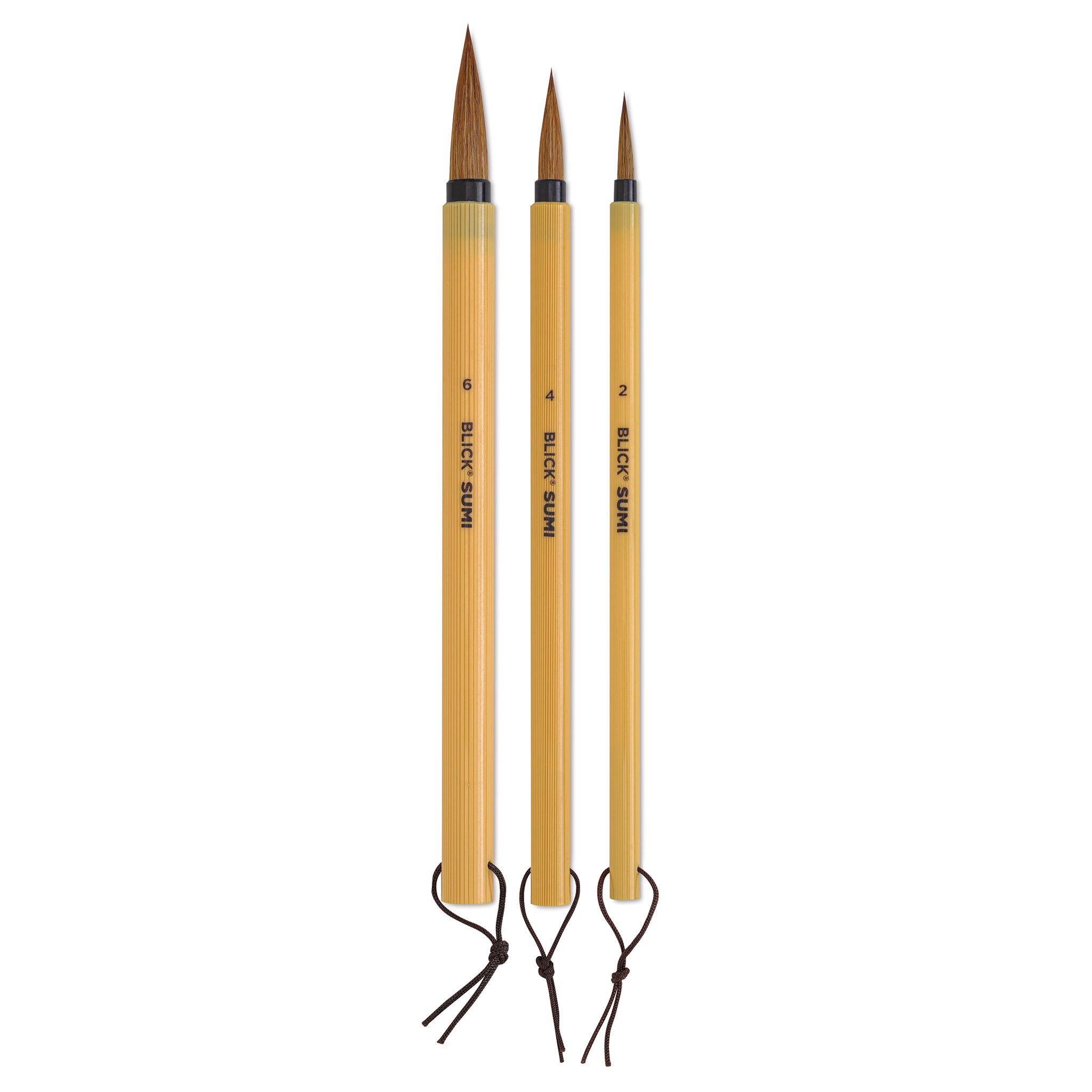Ideal for watercolors, ink, Japanese calligraphic lettering, and applying underglazes to ceramics, Blick Sumi Brushes feature long, soft, dyed goat hair filaments that taper to a precise point. Filaments are hand set in a durable plastic ferrule with a plastic bamboo handle.
