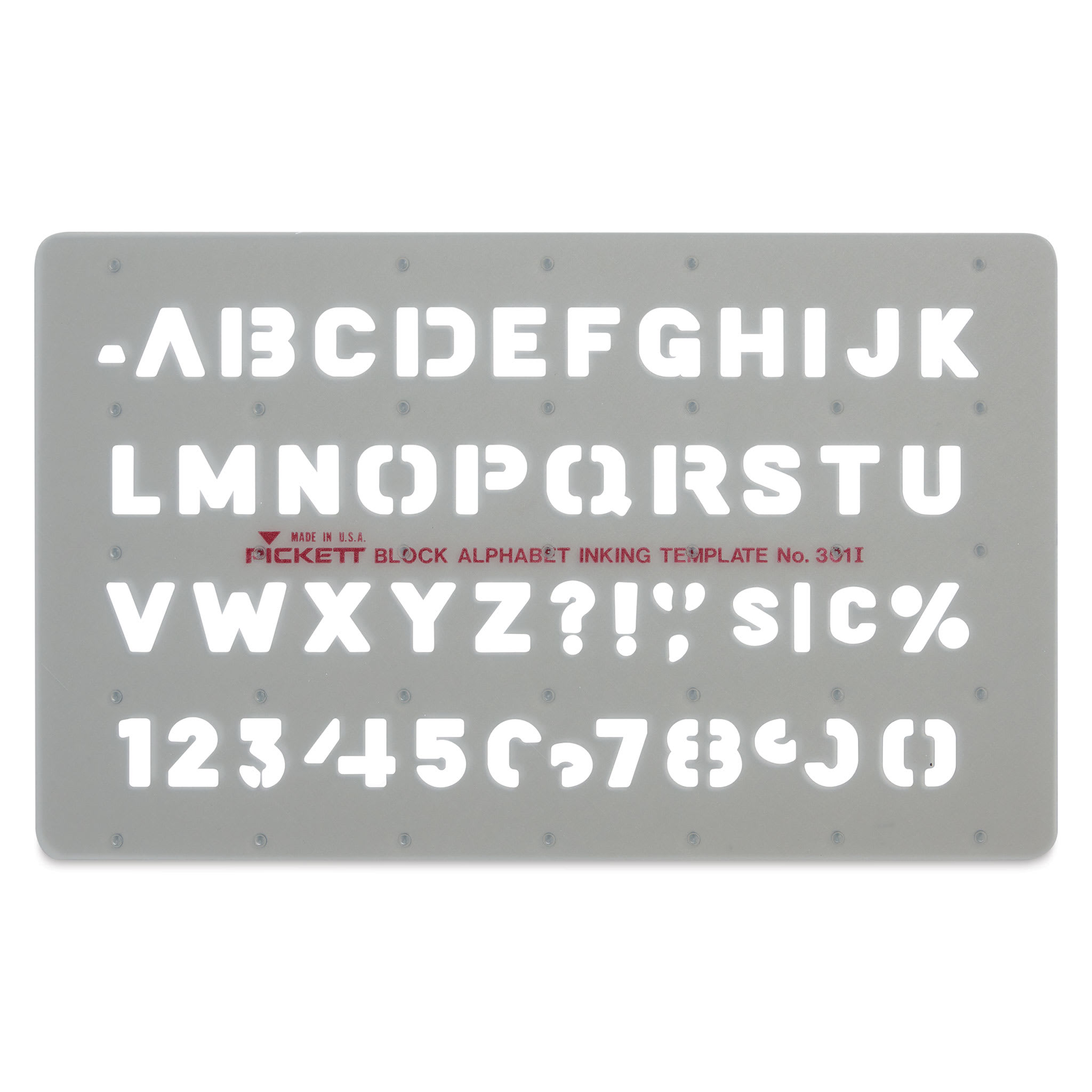 Featuring letters and numbers in a block alphabet font style, this Chartpak Pickett Block Alphabet Template comes in a translucent, smoke-gray color. Built-in risers and smooth apertures reduce smudged lines.