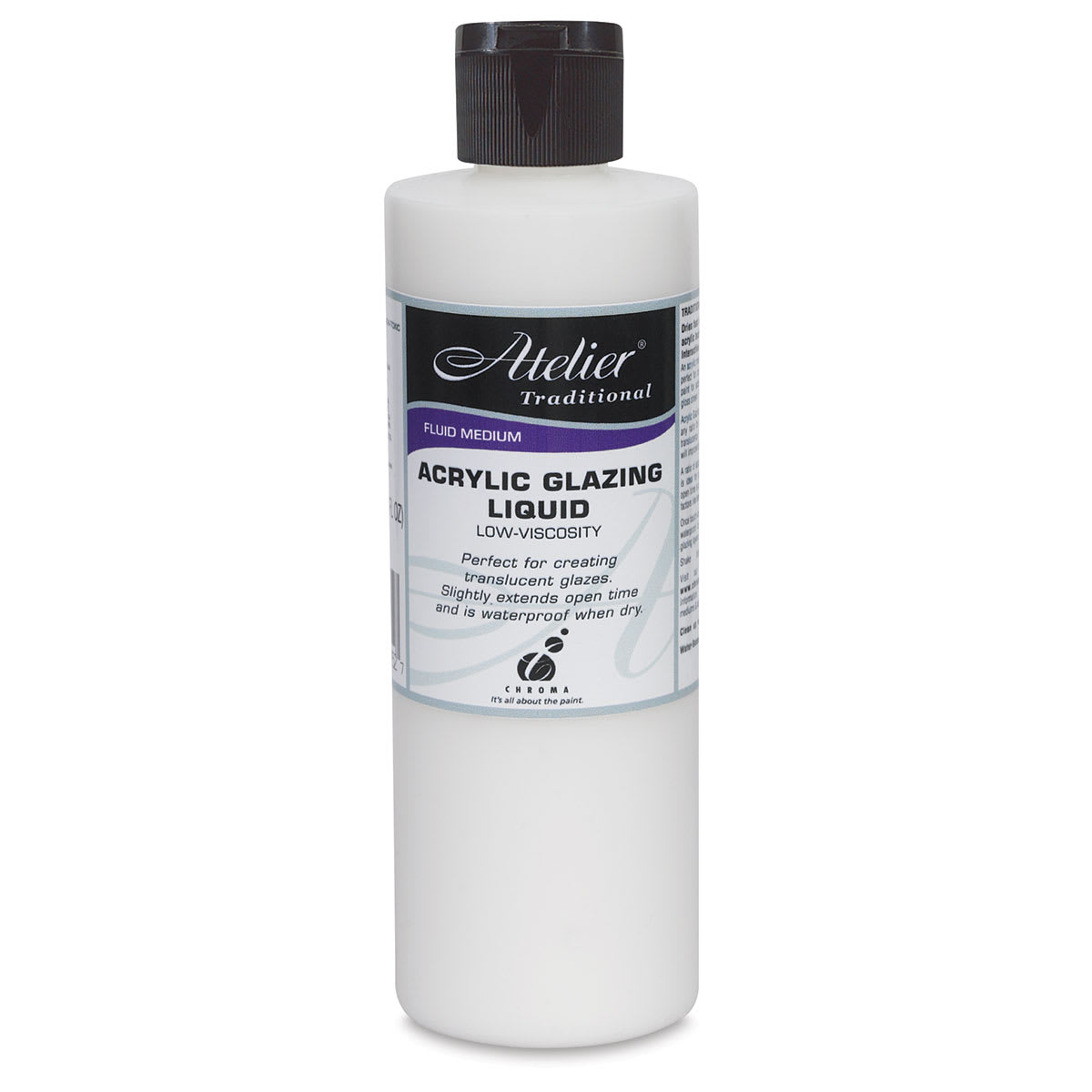 Chroma Atelier Traditional Acrylic Glazing Liquid is specially formulated for creating translucent glazes. Use this low-viscosity medium to increase the translucency, flow, and leveling of colors. It imparts a rich, glossy, oil-like sheen that is waterproof when dry.