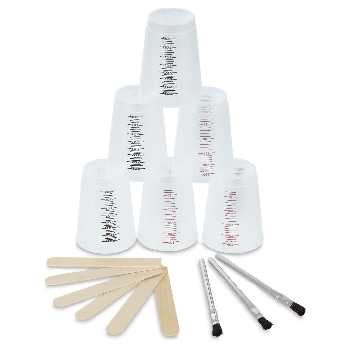 Convenient pack of six 8oz. plastic measuring/mixing cups, six stir sticks, and three craft brushes. Ideal for mixing resins, paint, etc.