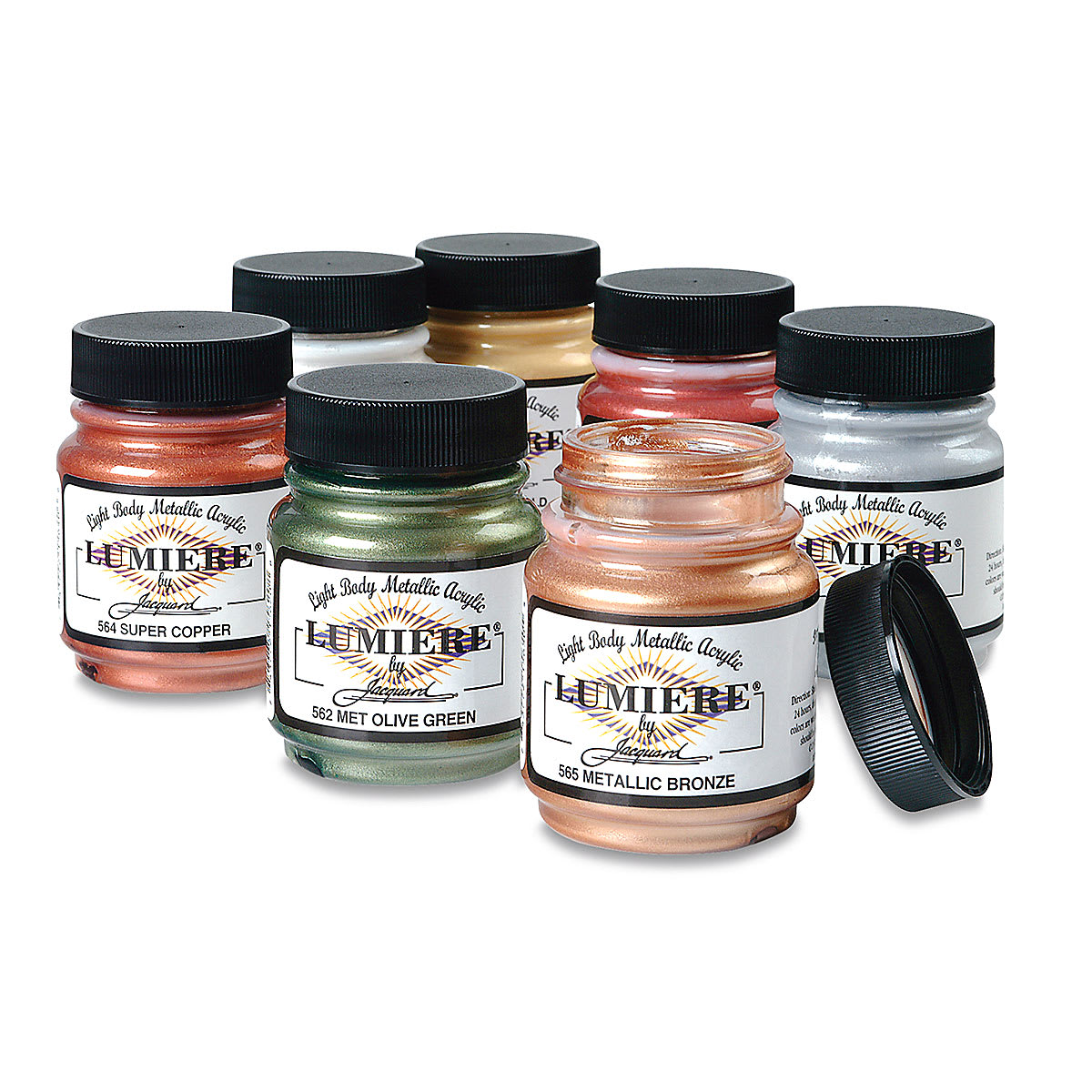 Jacquard Lumiere Acrylic Paints and Sets - Assorted 2.5oz jars shown with one lid removed