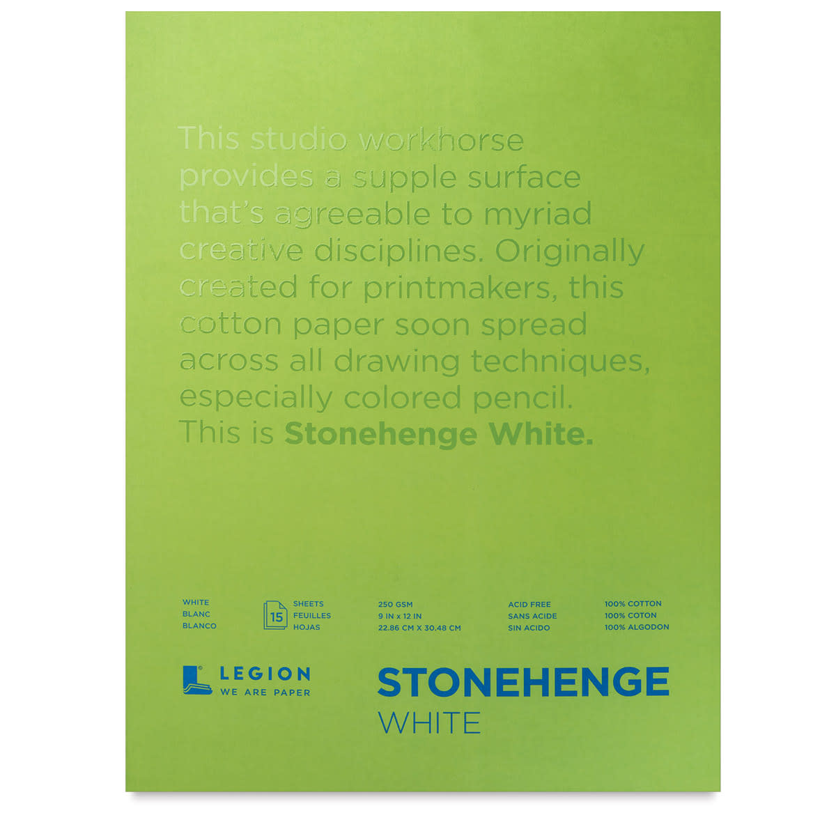 Stonehenge is a 100% cotton, neutral pH, 90 lb paper. It rivals European mouldmade papers with its ability to produce excellent results when used for printmaking and drawing. Available in convenient drawing pads, Stonehenge paper is ideal for etching, screen printing, embossing, drawing, and painti...