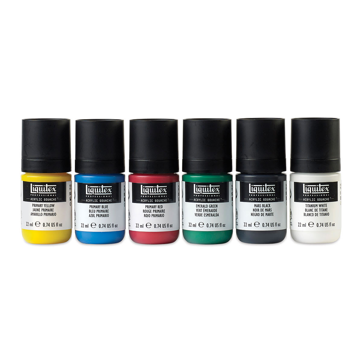 Liquitex Professional Acrylic Gouache - Essential Set of 12. Row of six paint jars.