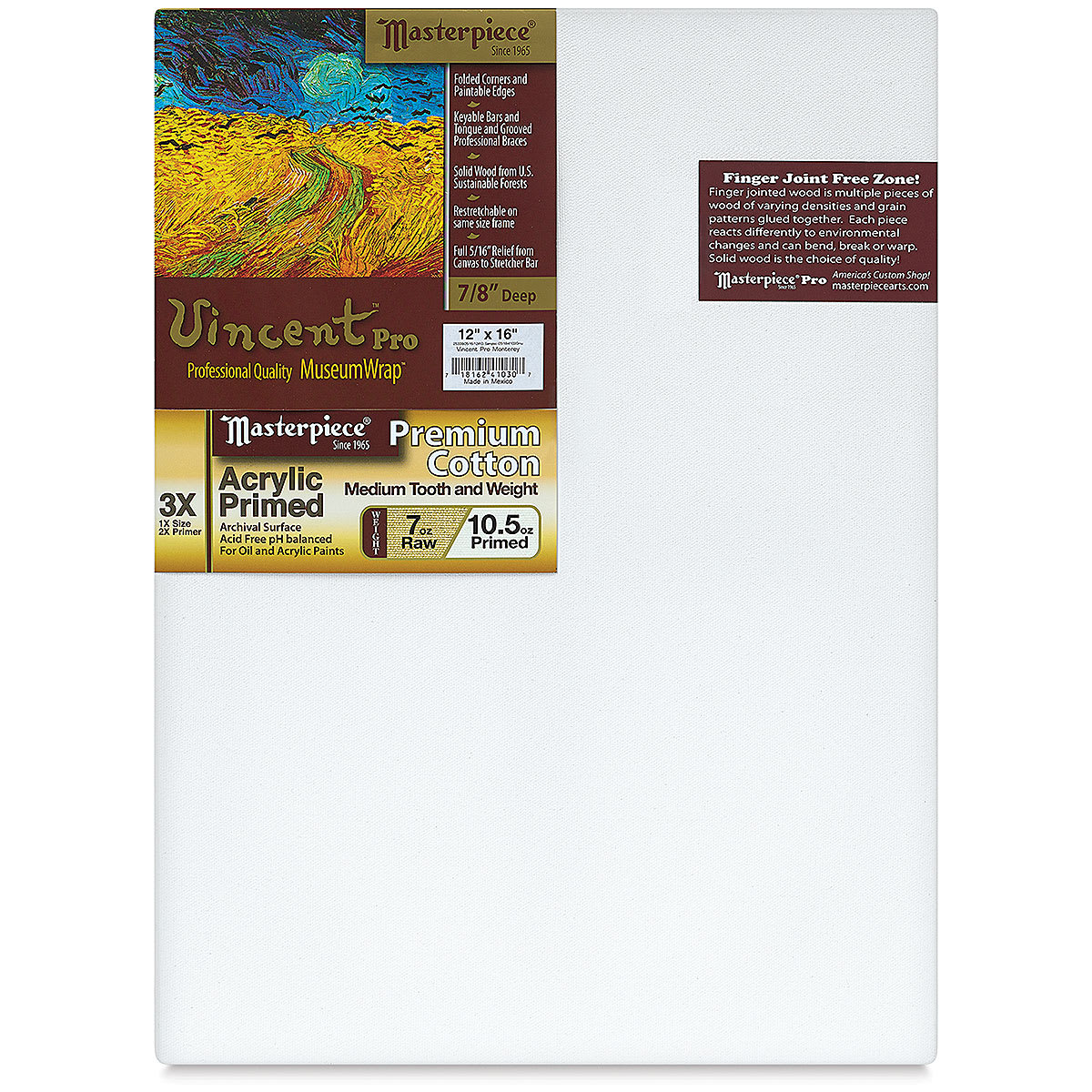 A favorite of professional artists across America. Stretched using the exclusive MuseumWrap method, which yields a balanced tension across the surface that's up to 50% tighter than average. Masterpiece Vincent Pro Monterey Cotton Canvas features proprietary Monterey cotton, sized and double-primed ...