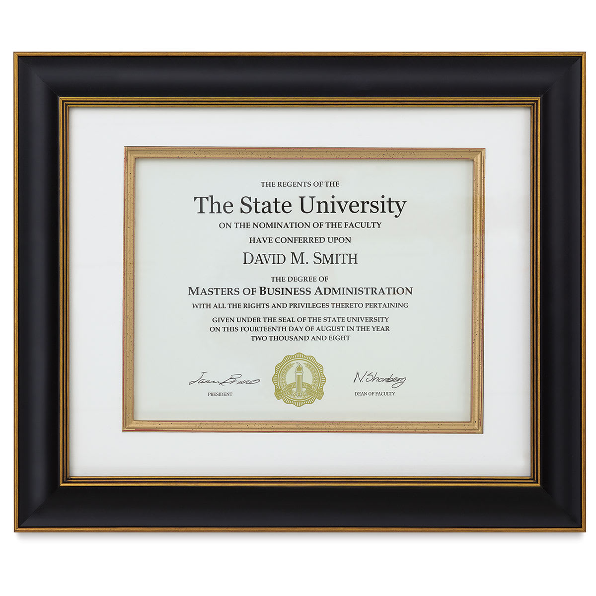 A scooped profile with a black and gold duotone finish and gold fillet mat will complement your valuable documents and photos. The Nielsen Bainbridge Tuscan Document Frame includes a 4-ply white mat, a 2-ply white mounting board, UV glass, and Artcare technology, the most effective system for prote...