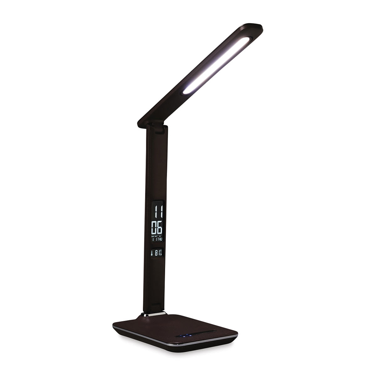 The OttLite LED Renew Desk Lamp, part of the Wellness Series, is big on features and even bigger on healthy lighting technology. The LCD screen displays the date, time, and ambient temperature while the USB port can charge tablets, phones, and more.