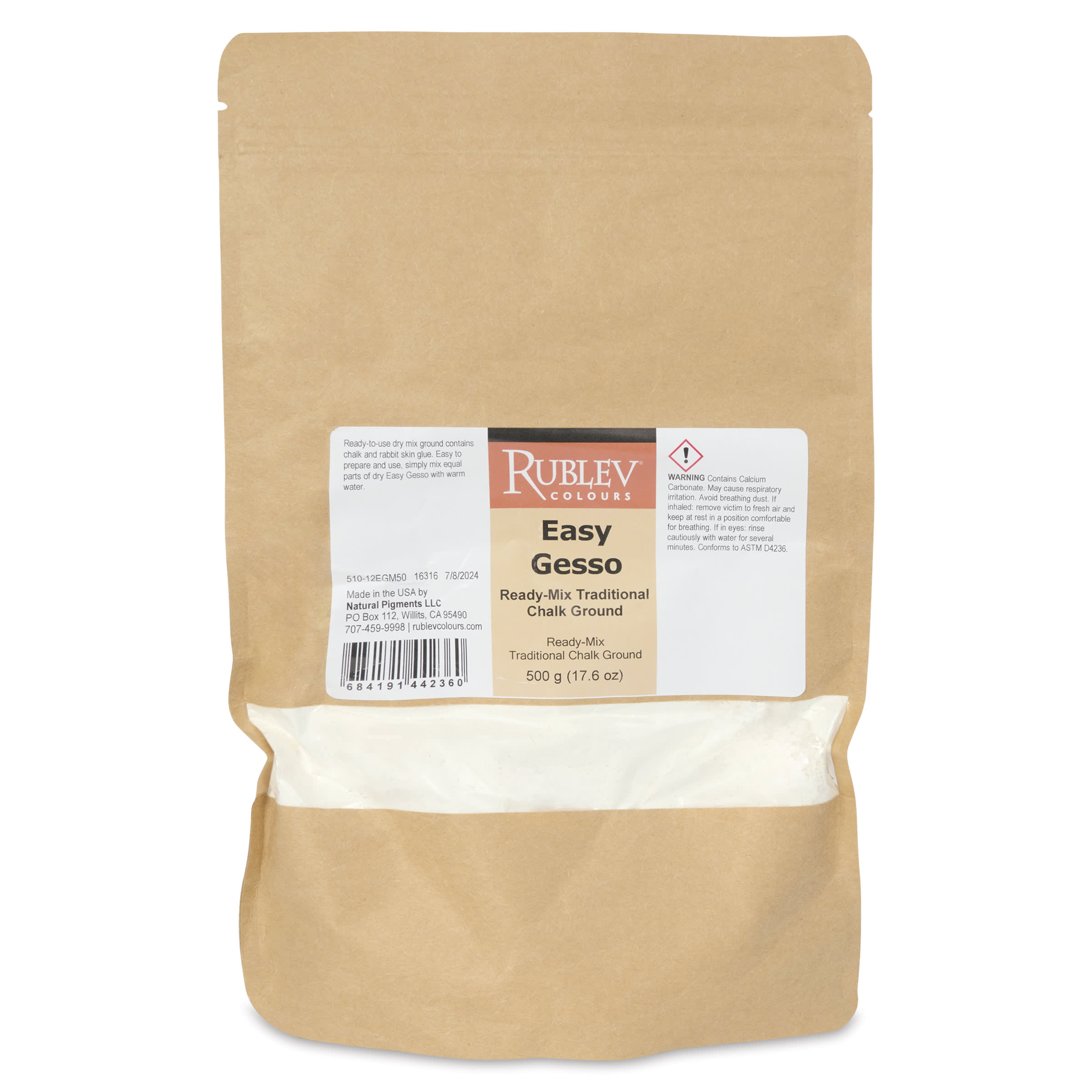 Craft authentic half-chalk grounds with ease using Rublev Easy Gesso Powdered Primers. Made from a traditional blend of hide glue and chalk, it creates a silky, absorbent surface ideal for water-based paints.